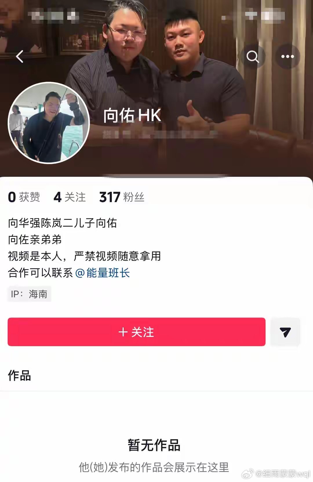 向佑开通账号向太小儿子向佑开通账号 近期,向华强家族小儿子向佑开通视频账号,但尚未发布内容,已有300多个粉丝。向佑想要干什么,外界并不清楚,但以他一贯的“败家子”形象,开设账号可能并不是他本人的想法,或者又是身边“朋友”的策划。