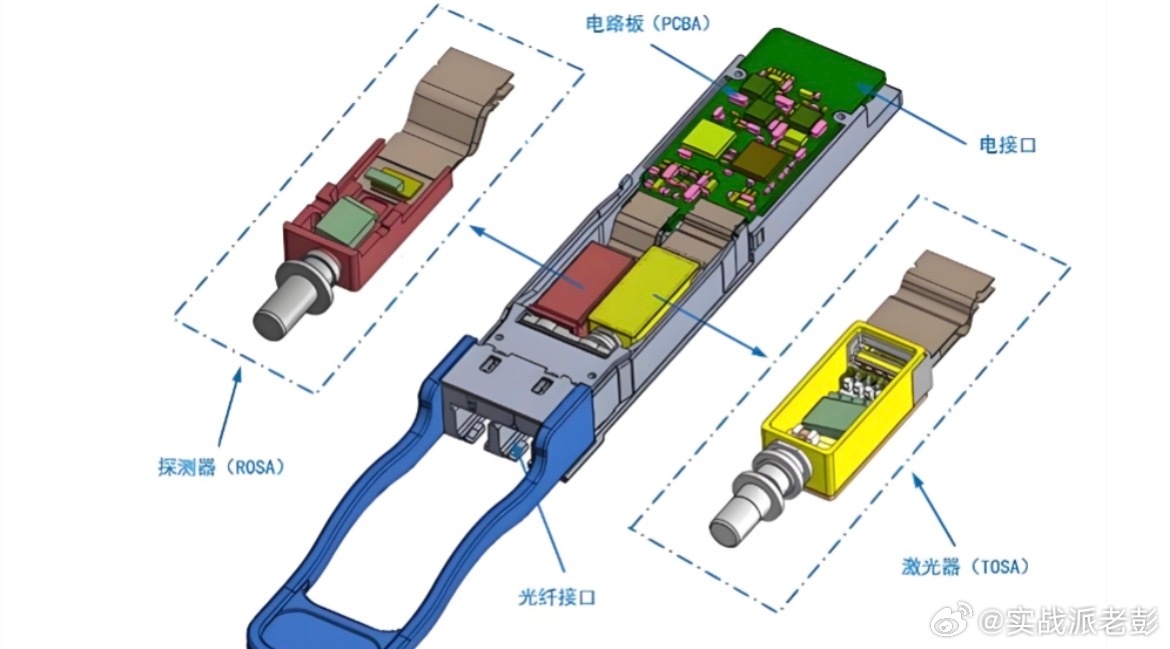 一. 可拔插光模块结构(1)光发射组件(TOSA):负责电信号转光信号,包括激光器(DFB、EML)、光学耦合元件(光隔离器、光调制器)等。(2)光接收组件(ROSA):负责光信号转电信号,包括光电探测器(PD、APD)、跨阻放大器(TIA)等。(3)电路与控制单元:DSP(数字信号处理器)、MCU(微控制单元)、PCB电路板、电源管理芯片等。(4)结构与封装单元:光接口(连接光纤)、电接口(连接交换机/服务器主板)、外壳、解锁机构等。