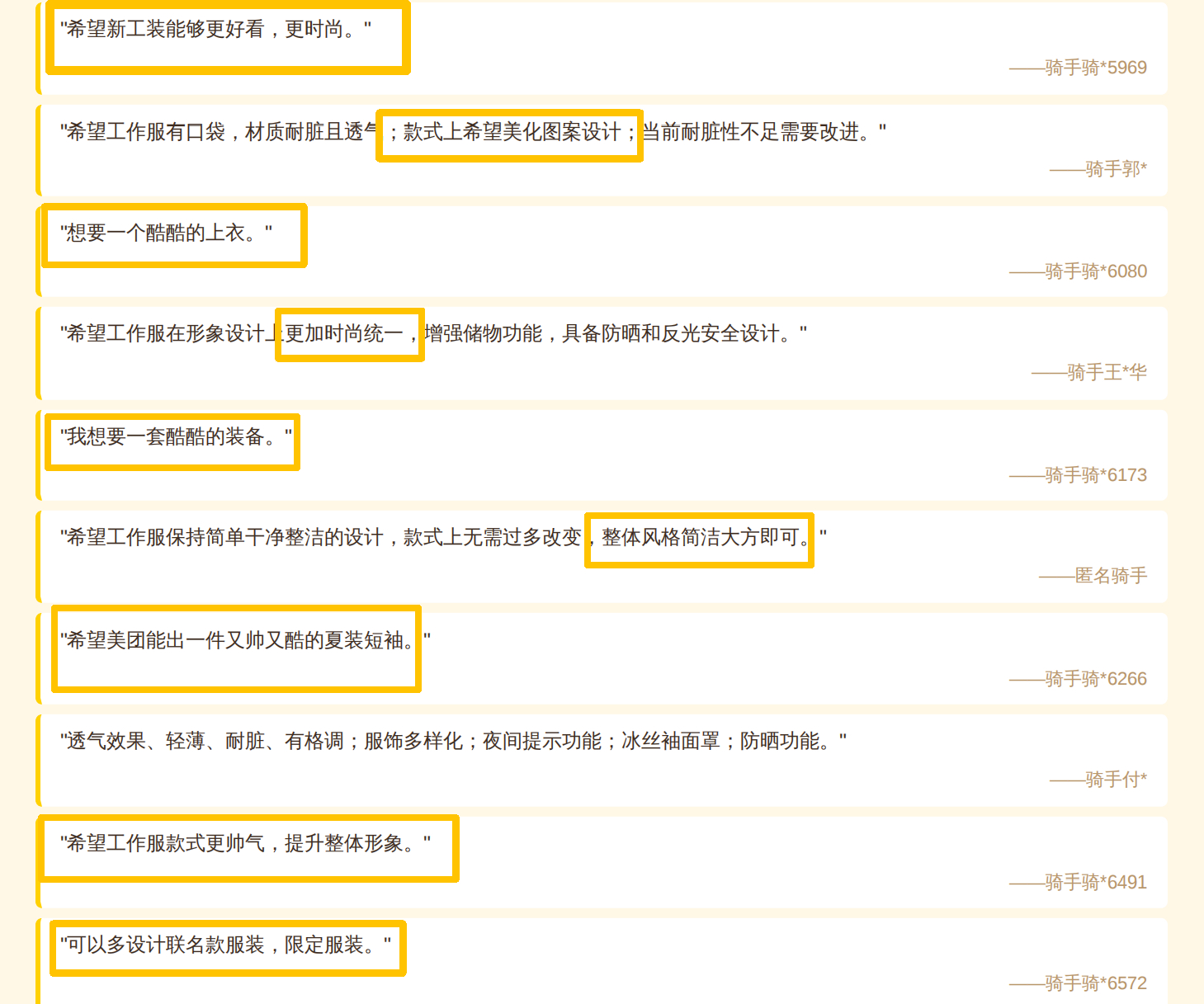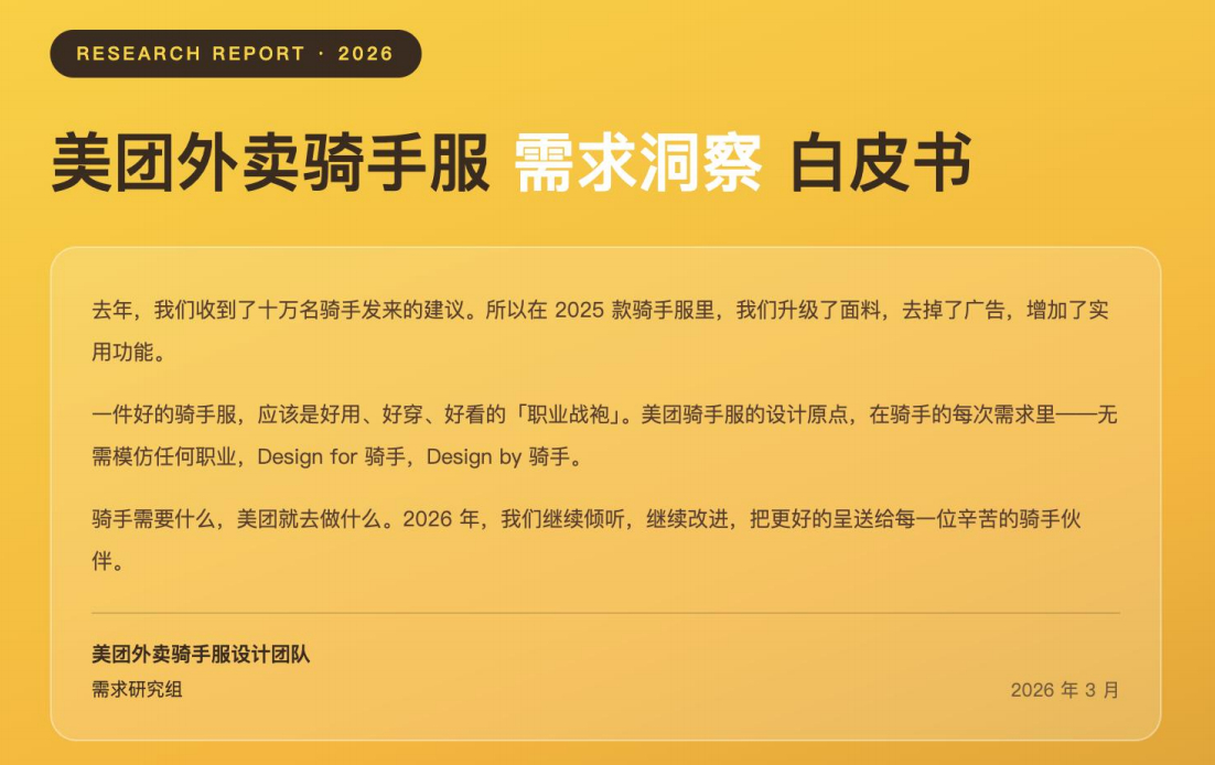 你以为骑手只关心配送时长?美团刚发布的《骑手服需求调研白皮书》里,写满了他们对“身上这件黄”的期待:想要更吸汗、想要口袋不磨手机、想要颜色亮一点再亮一点……甚至有人认真画了设计图!谁懂啊!美团也真的很听劝!第一届黄衣服设计大赛 它真的来了!让骑手自己来画、来投、来决定下一件“战袍”长啥样。最好的设计,从来不是设计师闭门造车,而是穿上它跑单的人说了算。从“赶路”到“赶时髦”,就差这一件黄衣服的距离。大家都来参加爆改👉🏻网页链接爆改穿搭的风吹到了骑手圈 春日添新装行路有暖意