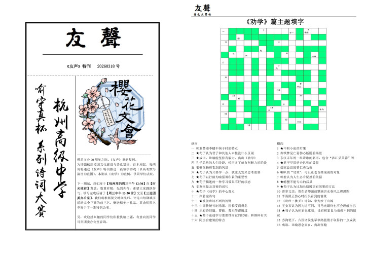 特刊确实有点特别,印的不是文章,而是两篇填字游戏。游戏中的题干,都以高考默写篇目为范围,内容以《劝学》为范例,供同学们试玩。