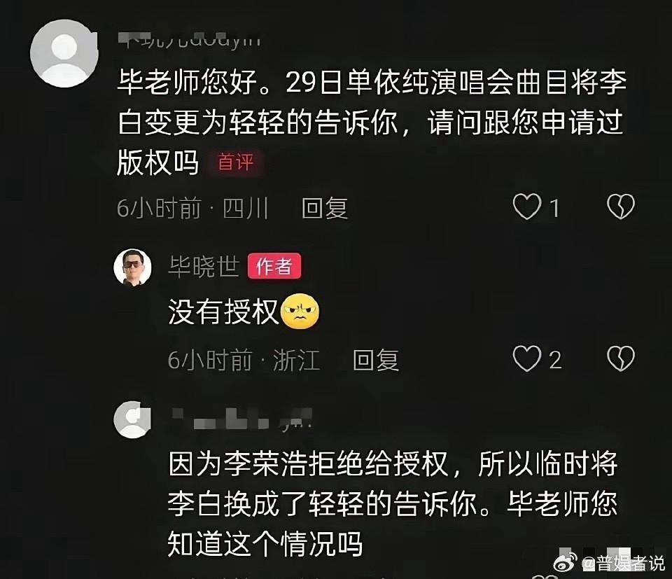 单依纯被爆大瓜啦!4月1号,就在她被爆歌曲侵权没几天,又有一个大瓜爆出来了。没想到啊,她临时换歌也出问题了,这到底咋回事呢?原来啊,前面刚因为《李白》侵权的事儿道了歉,后面临时换的歌又搞砸了。本来定好唱《李白》,可原作者李荣浩明确不给授权,主办方赶紧换成《轻轻的告诉你》来救场。谁知道,这首临时顶上的歌,居然也没拿到词曲作者毕晓世的授权。有网友直接私信问毕晓世,对方明确说“没有授权”,这条回复很快就删了,这更让这事儿有争议了。更让人觉得讽刺的是,这场风波里的两次版权问题,都是主办方犯了同样的错。先是没拿到《李白》的授权就让唱,被李荣浩公开维权后,临时换歌又跳过了版权审核这一步。这边单依纯刚说会重视版权、承担责任,那边换歌操作就翻车了。现在,《李白》的侵权事儿还没完全解决,《轻轻的告诉你》又让她陷入新的争议里。一场演唱会连着两次版权出问题,也给这个行业提了个醒:临时救场不能当成不重视版权的理由,用任何作品都得走正规的授权流程。你对这事儿咋看呢?