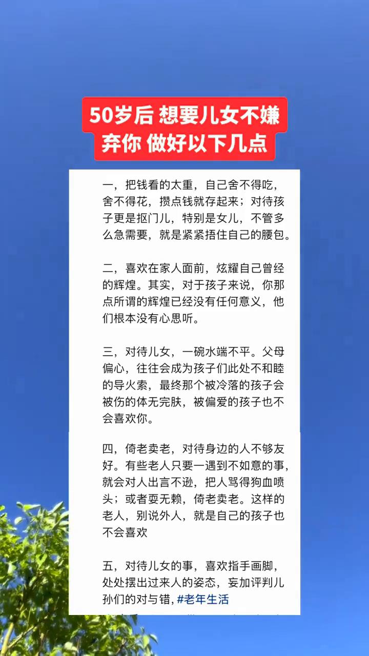 50岁后想要儿女不嫌弃你做好以下几点。 ·一,把钱看的太重,自己舍不得吃,舍不得花,攒点钱就存起来;对待孩子更是抠门儿,特别是女儿,不管多么急需要,就是紧紧捂住自己的腰包。 ·二,喜欢在家人面前炫耀自己曾经的辉煌。其实,对于孩子来说,你那点所谓的辉煌已经没有任何意义,他们根本没有心思听。 ·三,对待儿女,一碗水端不平。父母偏心,往往会成为孩子们此处不和睦的导火索,最终那个被冷落的孩子会被伤的体无完肤,被偏爱的孩子也不会喜欢你。 ·四,倚老卖老,对待身边的人不够友好。有些老人只要一遇到不如意的事,就会对人出言不逊,把人骂得狗血喷头;或者耍无赖,倚老卖老。这样的老人,别说外人,就是自己的孩子也不会喜欢。 ·五,对待儿女的事,喜欢指手画脚。处处摆出过来人的姿态,妄加评判儿孙们的对与错。