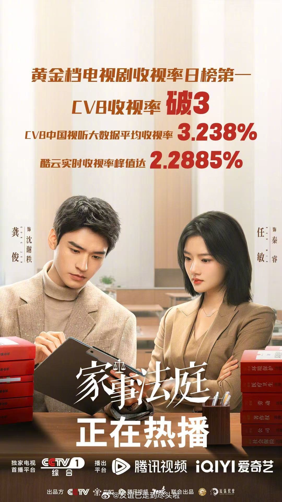 《家事法庭》央视一直在加广,龚俊的招商能力真不错,收视率也很好,开播以来cvb第一,看来电视机观众群很买单