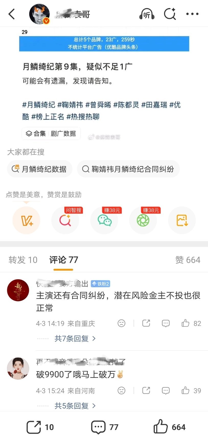有博主发博说月鳞绮纪 热度高却没有广告商投广,结果评论区有粉丝说是因为主演有合同