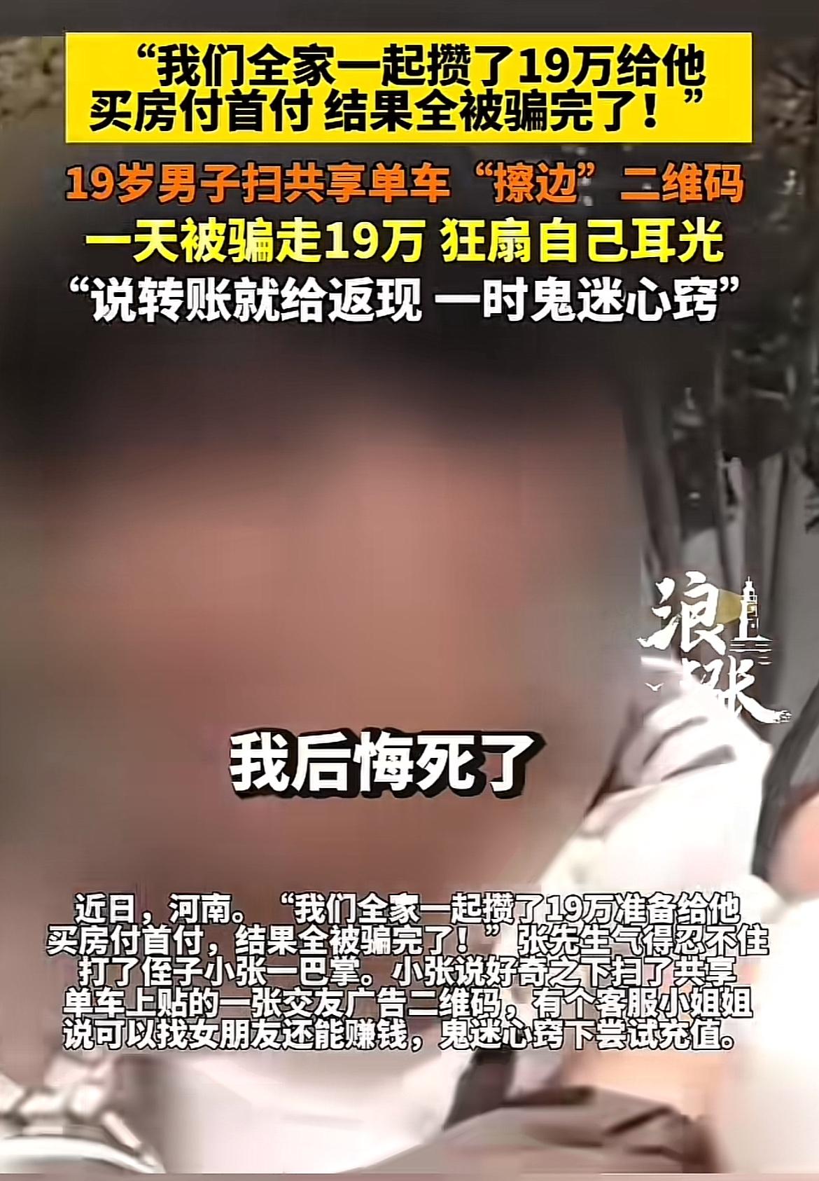 现在的诈骗手段防不胜防,19岁男子扫个码就被骗19万,这谁能想到啊!就像河南洛阳那个22岁的小张,本想骑共享单车,看到车上美女卡片上的二维码,好奇一扫,噩梦就开始了。 对方先给他发玉足视频,又说付款开通权限有更多惊喜,还展示各种美女画面,甚至抛出充钱返现的赚钱项目。小张心动转账,结果19万三代人存的房子首付款全没了,最后只能狂扇自己耳光,后悔也晚了。年轻人可得擦亮眼睛,别被这些诱惑冲昏头脑,不然辛苦攒的钱就打水漂了。