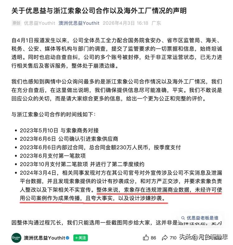 事情起因是4月1日央视曝光,优思益号称澳洲进口,实则海外工厂造假,不少产品是国内代工,靠虚构海外产地、虚假宣传收割消费者。