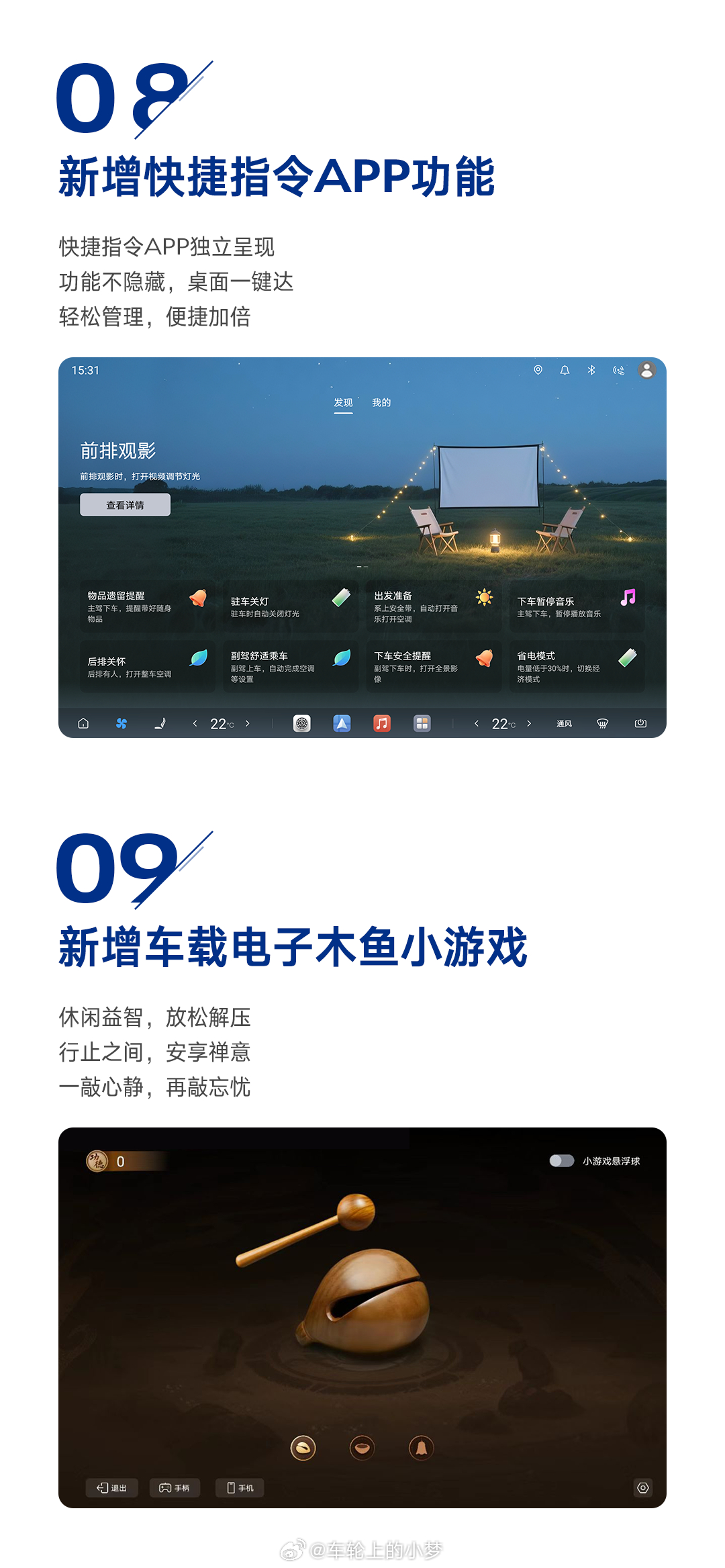 座舱UI焕新,分屏逻辑更顺手。新增的蚂蚁森林收能量、车载电子木鱼、多屏同登,明显是奔着“好玩又好用”去的。从智驾到座舱,这次更新算是把“常用常新”这四个字玩明白了。