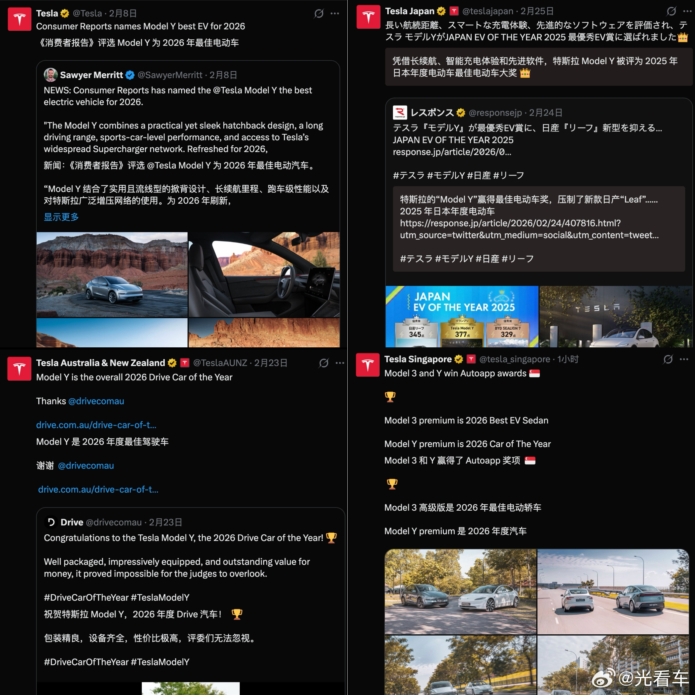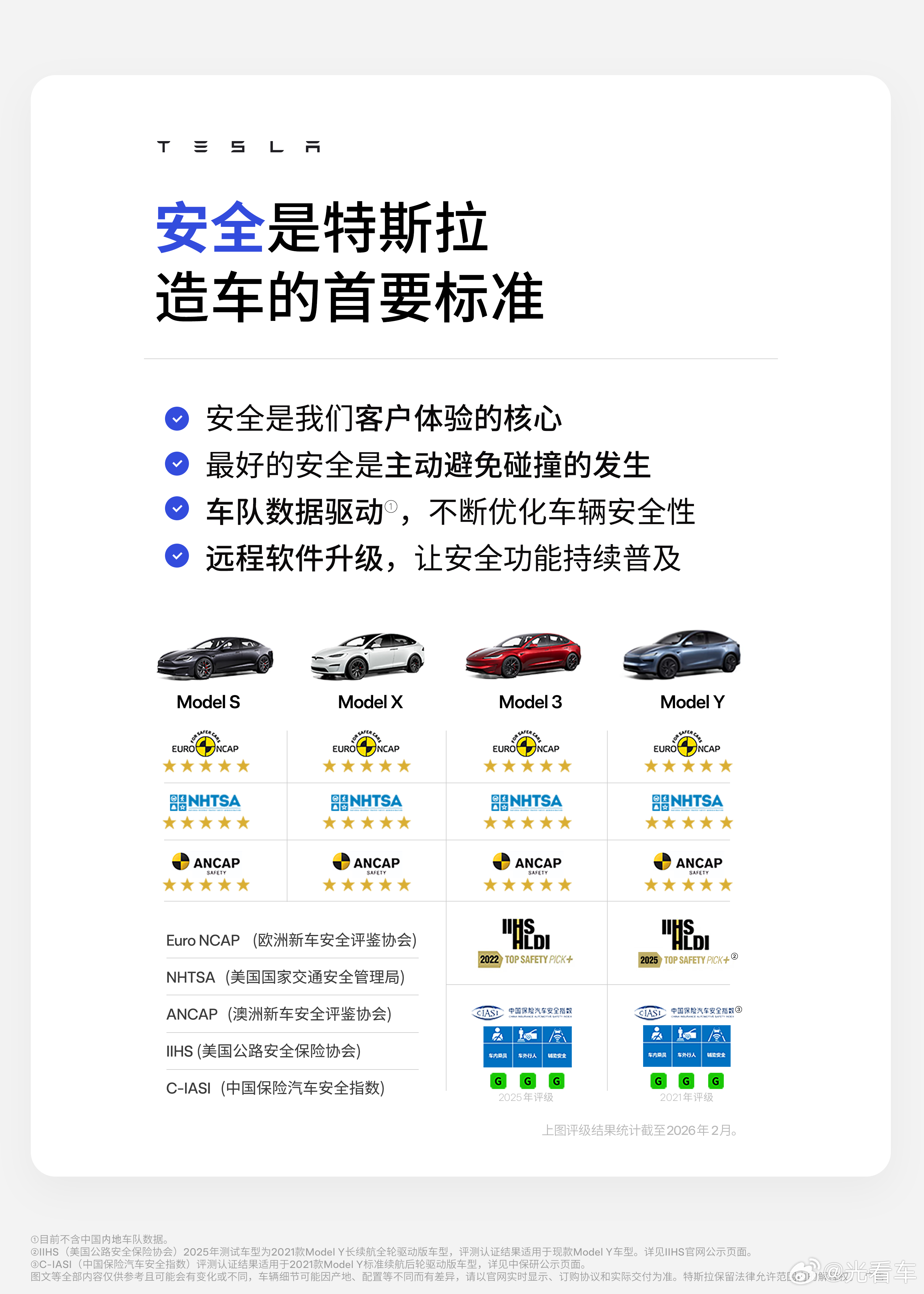北京时间2026年4月2日,特斯拉发布2026年第一季度全球生产与交付报告。数据显示,本季度特斯拉全球共生产纯电动车超40.8万辆,同比增长12.7%;交付量超35.8万辆,同比增长6.5%。同期,特斯拉储能产品装机量达到8.8吉瓦时。其中,特斯拉上海超级工厂3月交付电动车超8.56万辆,创年内新高;第一季度交付21.3万辆,同比增长23.5%。特斯拉第一季度财报将于北京时间4月23日发布。据悉,届时公司将进一步披露其在人工智能、人形机器人、电动车、能源等多领域的进展。Model Y 2025年蝉联全球销冠,Model 3 十年售出300万台据权威分析机构Focus2Move统计,Model Y 2025年获全球乘用车销量第一名。Model Y 已连续三年蝉联全球销冠,累计销量超过400万辆。2026年也是Model 3 问世的第十年,全球累计销量超300万辆。2026年第一季度,特斯拉在全球市场延续强劲的增长势头。特斯拉上海超级工厂3月交付电动车超8.56万辆,创年内新高;第一季度共交付21.3万辆,同比增长23.5%。Model Y 蝉联国内乘用车批发销量冠军。同时,上海超级工厂生产的Model 3/Y 稳居1月单车型出口量前三名,合计超5万台出口海外市场。在亚太及欧美多个市场特斯拉都获得了亮眼的销量成绩。持续向好的全球市场表现,展现了特斯拉在产品力上的稳固优势与品牌号召力。在全球油价高涨的背景下,越来越多燃油车主选择置换购入特斯拉,转向省钱省心的纯电出行。在中国市场销售政策方面,特斯拉宣布,4月30日前下单可享8000元限时车漆选装福利。同期,Model 3 和Model Y(全系)可选择首付7.99万元起的7年低息方案,国家贴息后首月月供分别低至1759元与2188元;Model Y L可选择首付9.99万元起的7年低息方案,首月月供可低至2849元。安全、智能,产品力屡获全球权威机构认可不仅在全球消费者中广受欢迎,各大媒体和权威机构测评中,特斯拉的硬实力也经得起考验。得益于优秀的三电系统、便捷的充电体验、常用常新的智能软件等优势,Model Y 在权威杂志《消费者报告》“2026年度十大最佳车型”榜单中获评“最佳电动车”。此外,Model Y 还在澳大利亚与新西兰分别摘得“年度最佳驾驶车型”与“年度电动车”桂冠,并在日本获评“2025年度最佳电动车”。Model 3 同样表现出色,在新加坡被评为“2026年度车型”及“最佳电动轿车”。特斯拉在菲律宾被TopGearPh评为“年度突破品牌”,并获“最佳新技术实施奖”。奖项之外,特斯拉还收获全球权威测评机构对其安全性的最高认可。秉持“安全至上”原则,特斯拉全系车型均按照全球最严苛的安全标准设计制造。目前,特斯拉S3XY车型已在美国国家公路交通安全管理局(NHTSA)、欧洲新车安全评鉴协会(Euro NCAP)、中国保险汽车安全指数(C-IASI)及澳大利亚新车安全评鉴协会(ANCAP)等全球多家权威机构的测试中获得“五星安全”评级,为用户提供全方位保护。来自不同市场的权威认证,印证了“买车就买全球车型”的重要性。上海超级工厂生产的车辆供应全球多个市场,需同时满足各地对车辆的检验标准,这为产品质量增添了多重保障。近日,特斯拉公司副总裁陶琳发社交媒体表示,“质检团队会定期抽取多台白车身做“破坏性拆解”,对车身连接工艺强度、防腐和耐久表现进行无死角检查。以Model Y 为例,单车近3000个焊点、400多段涂胶,所有焊接质量、焊点尺寸、涂胶质量、连接强度都要逐项过关。抽检车辆会被报废,但留下的宝贵数据,会进入工程和制造体系,帮助我们把后续每一台车都造得更可靠。”近日,德国一位Model S 车主晒出里程记录,12年来这台特斯拉已行驶超270万公里,再次印证了特斯拉车辆的耐久与可靠性。除了安全可靠的车辆硬件,特斯拉的核心优势之一还在于其强大的软件能力。仅在2022至2025年间,特斯拉就累计推送了58次OTA远程软件升级,带来了超过100项功能优化与创新。车主不用多花一分钱,就可以享受最新功能。耐用的硬件与常用常新的软件功能让市场对特斯拉车辆的长期产品力充满信心,并直接反映在车型保值率上。据中国汽车流通协会发布的2月及3月统计数据,Model X/ 3/ Y 车型连续两月包揽三年车龄纯电动车型保值率排行榜前三名。