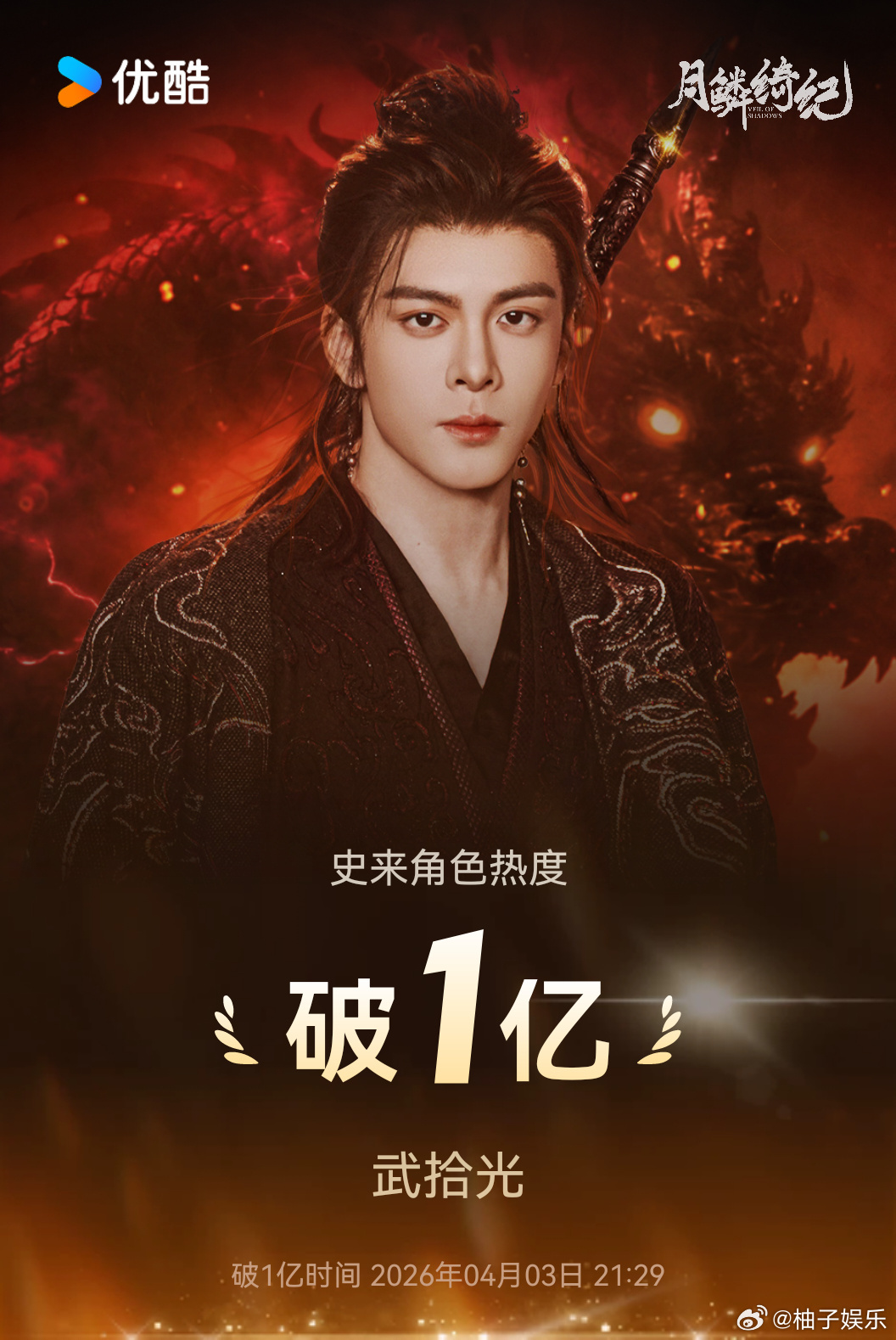 恭喜曾舜晞开播57小时,武拾光优酷站内角色热度值破亿,成为优酷首位角色热度破亿男艺人,实至名归!