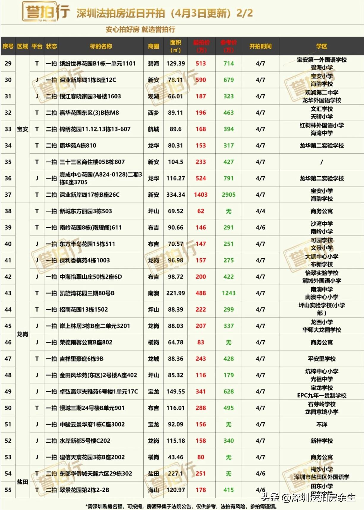 深圳法拍房:近期开拍,纯水岸4折拍卖~ 1、纯水岸十四期,单价只要5万,4折拍卖,很不错 2、蛇口·枫叶望海公馆,次新楼,看海景,只要5.5万,价格很不错 3、阳光棕榈园,单价5.4万,价格不错 4、太古城,单价8.1万,价格不错 5、星河丹堤,单价4.6万,价格不错 6、尖岗山名苑,高层视野很好,单价5.4万,很不错 深圳法拍房余生 深圳法拍房 深圳楼市 房地产