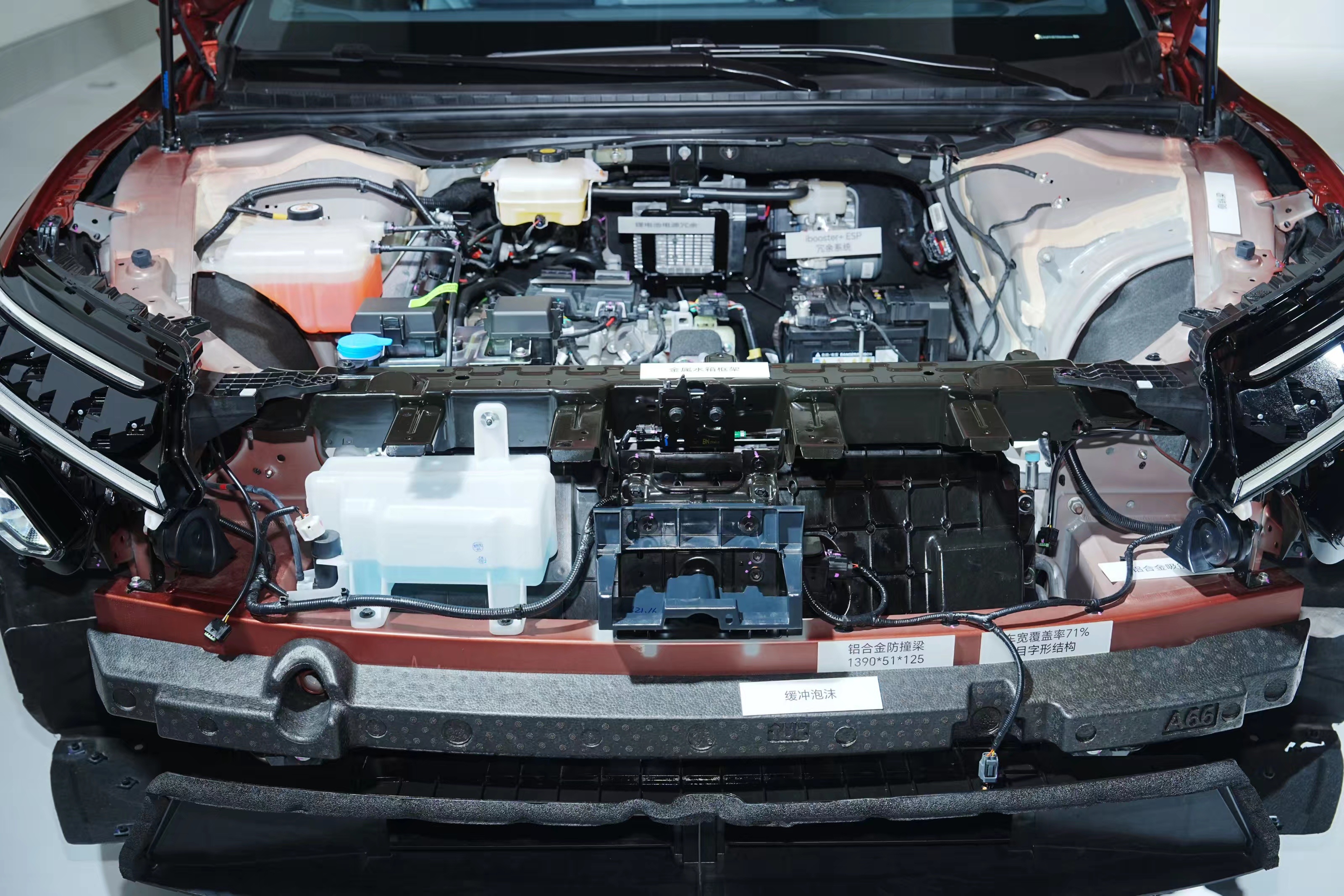 比如前舱,拆出来能看到是5横6纵2竖,一共13根梁。这些受力梁相互交织,层层化解冲击,无论是正面碰撞还是偏置碰撞,都能把力量均匀分散。这种复杂的传力结构不是一句“结构加强”就能带过去的了,它需要有非常优秀的白车身受力设计,同时也说明铂智7这款车的安全设计,确实是按更高标准去做的。