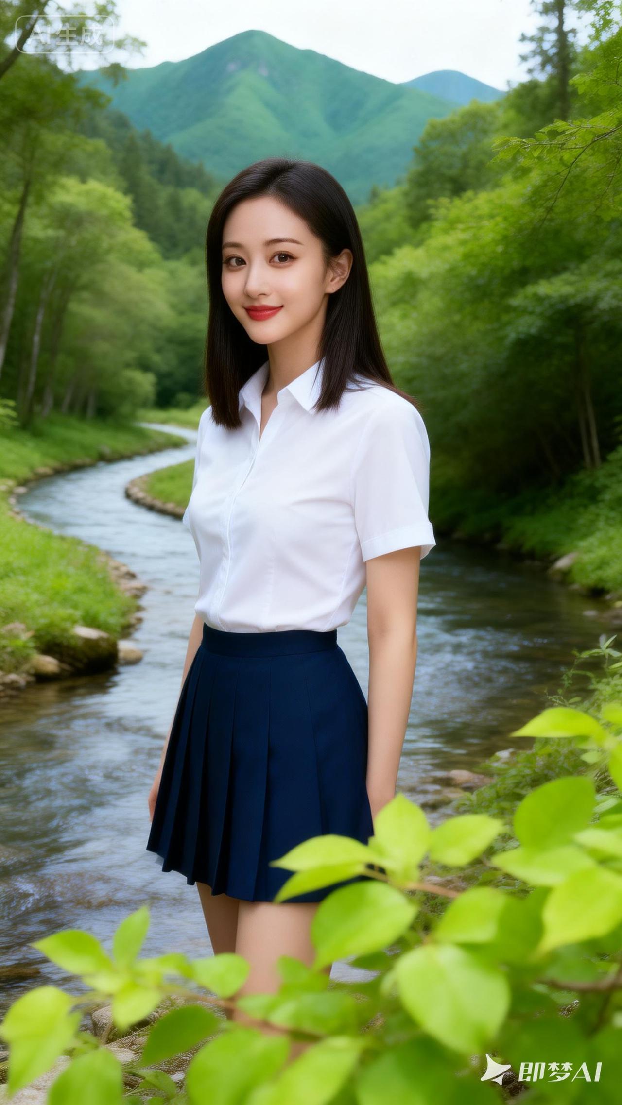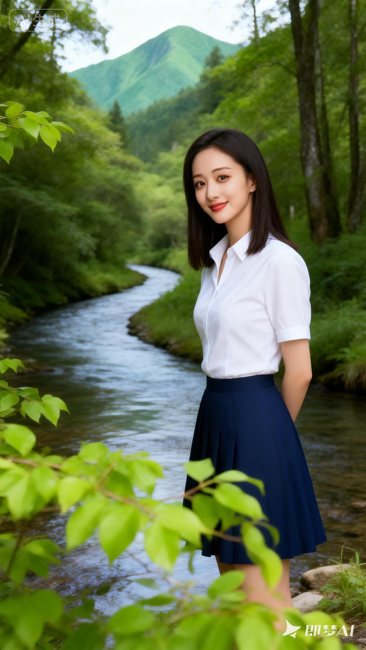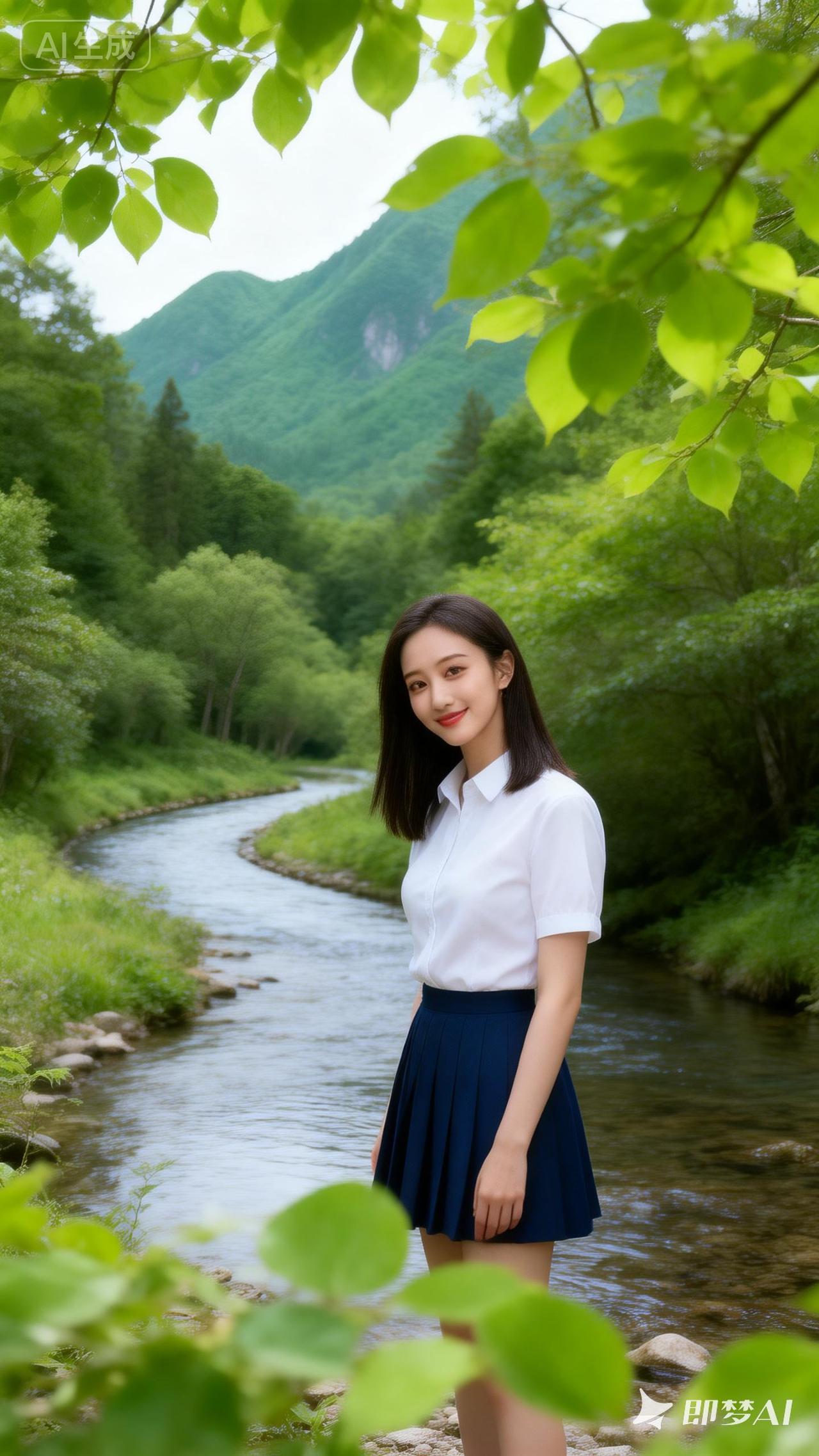 夏日清新穿搭,白衬衫+蓝短裙,自然风景中凹造型