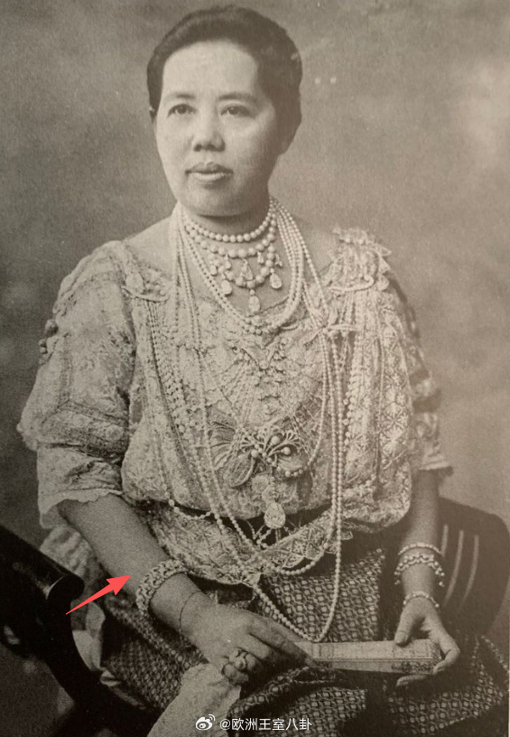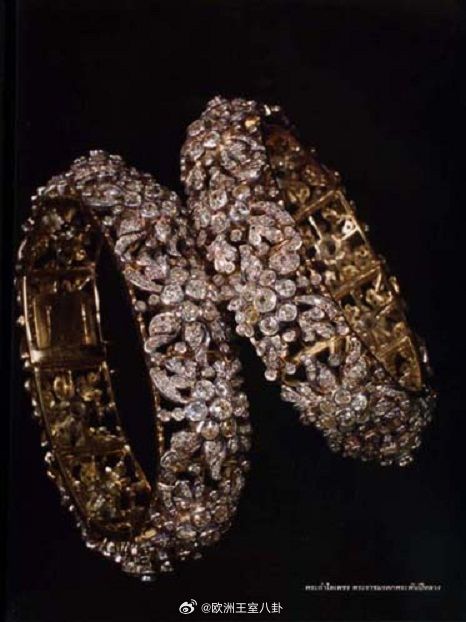 珠宝 泰国王室的雕花钻石手镯,一套八只,是他泰祖上老货了,能找到五世王后的佩戴照。当然最主要的佩戴者是九世王后诗丽吉,在五六十年代高频叠戴,甚至试过八只全部整上(能练麒麟臂)。七十年代开始逐渐不见,压到2023年由十世王后苏提达各戴一只出席英王查三加冕礼,看好苏提达月底在瑞典再戴