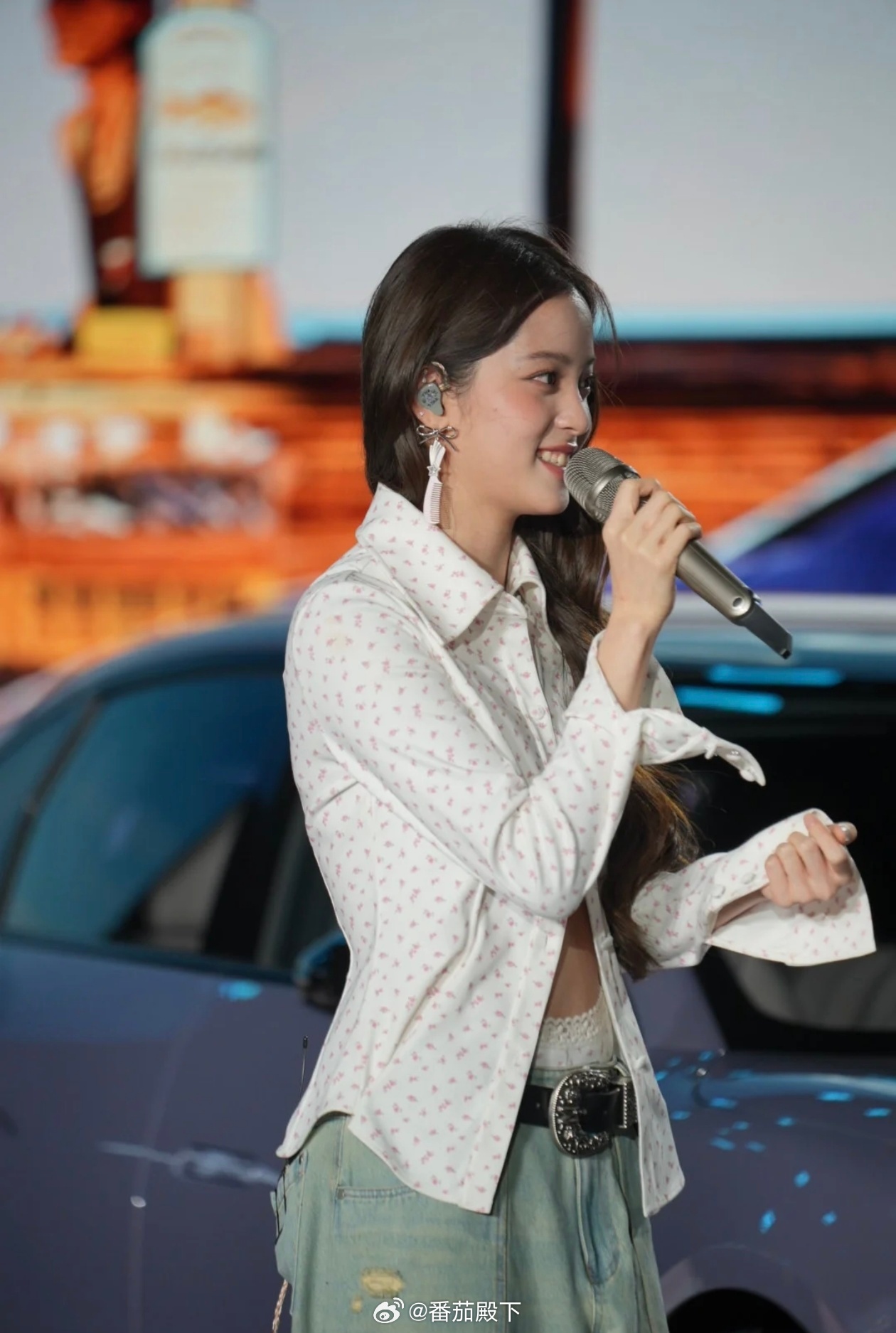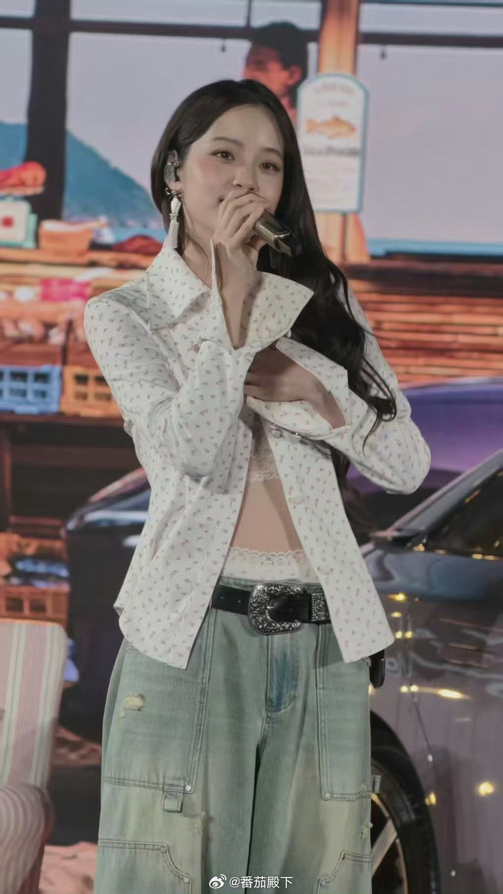 欧阳娜娜小鹏发布会杀疯了!甜飒双杀,新车都被她衬得更香了舞台上的她碎花短上衣配