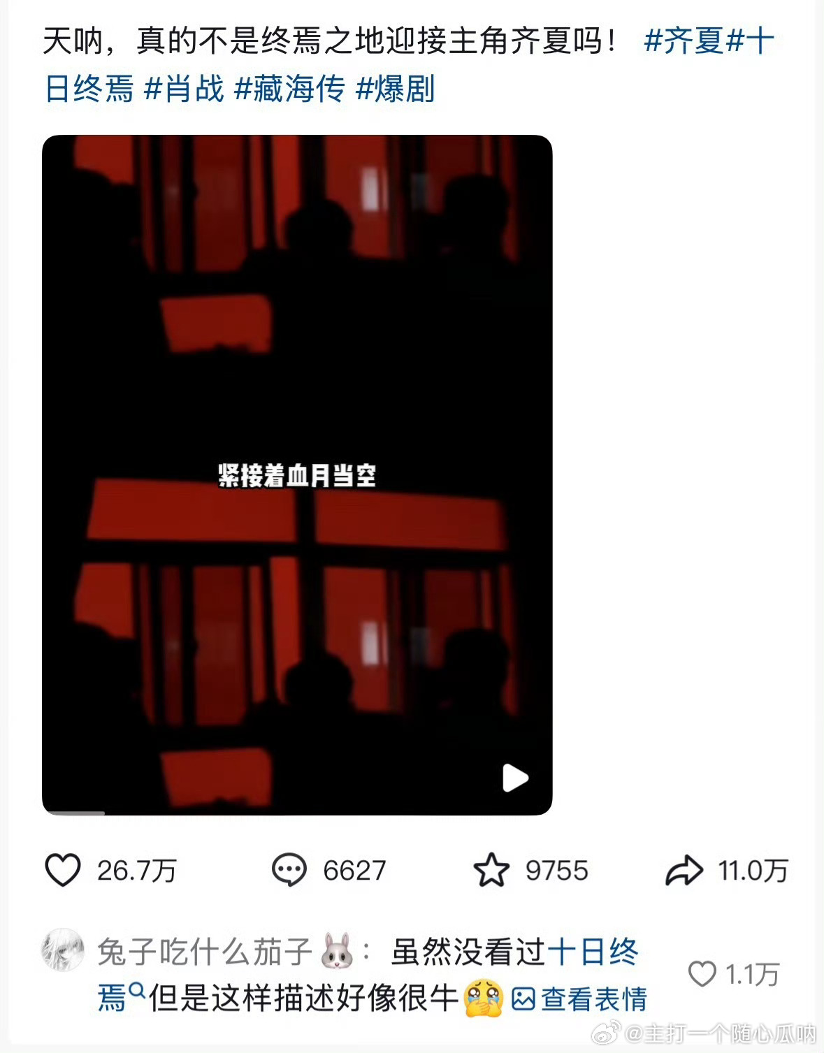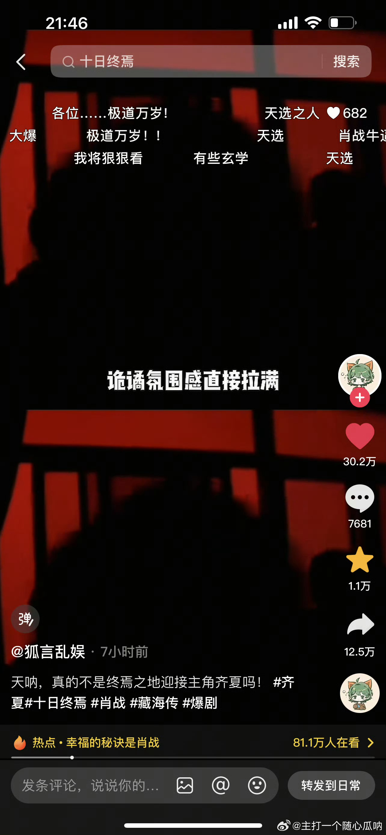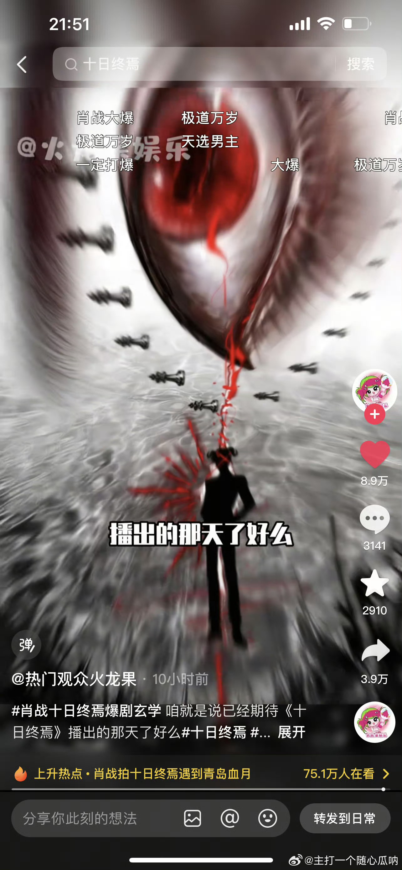 肖战十日终焉爆剧玄学“玄学体质,气运之子”好火啊,短时间内好几十万赞,真不亚于一