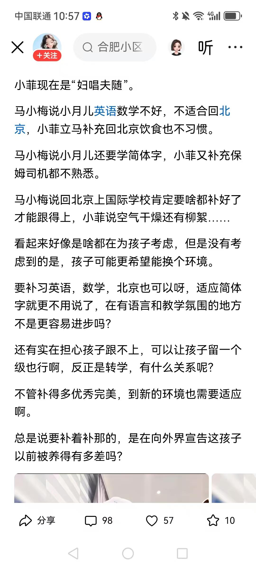 一有后妈就有后爹,小梅不愿孩子回北京,她去台湾好有借口,可怜俩个孩子,奶奶应该给俩个孩子做主,别让他们参手了,后妈心机太重。 每年往返的机票钱都够请好几个辅导老师,原来是根本不想孩子回北京。 事实他们应该换个地方生活更好。一句话就是不想让他们和奶奶接触。他们奶奶应该随缘,凡事都要讲缘分,真的。 照这么说,孩子哪里都不要去,只有留在台湾最好!现在不趁着适应能力强的年龄快回来适应,以后就别想了。 趁早回京适应快,饭菜还是那保姆,北京有更好的老师课外辅导,两边走太累。 感觉这个后妈以后还得离,又想要房子,张兰肯定不会同意买房,所以她现在又不回北京了张兰现在知道她真面目已经不鸟她了。 等到孩子在台湾长大了,再回北京就太迟了,那真就是不适应了,三观都形成了,到时候变不了,你叫他回都不会回了。 根本就是为小梅回娘家方便找借口,这样做苦了两孩子。 回北京一对一请家教不行?饮食就用河南村里那保姆她做的饭孩子习惯? 憨憨的,鼻子总是被别人牵着走,男人挺不直腰杆。被下降头了,有后妈就有后爸,古人诚不欺我。