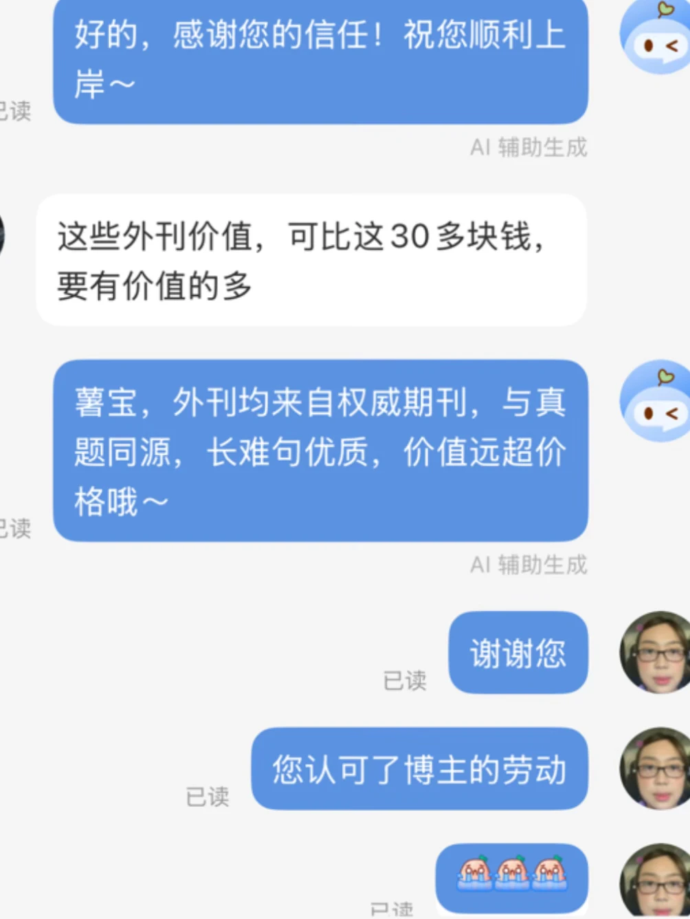 没想到有一天能够听到考研人说: 我的考研外刊卖30+太便宜了[笑哭R] “正愁不知道怎么筛选呢” “外刊原有的价值不止于此!” 那一刻我直接原地旋转跳跃我闭着眼!熹贵妃回宫 我希望许过的愿望一路生花 下一站 上岸 莫欺少年穷 [棒R]其实 外刊适合的 恰恰是需要节省时间的同学 如果你需要阅读优质的外刊提升阅读理解的能力,但又不知道也没有时间筛选的话。 那这份外刊就十分适合你啦!