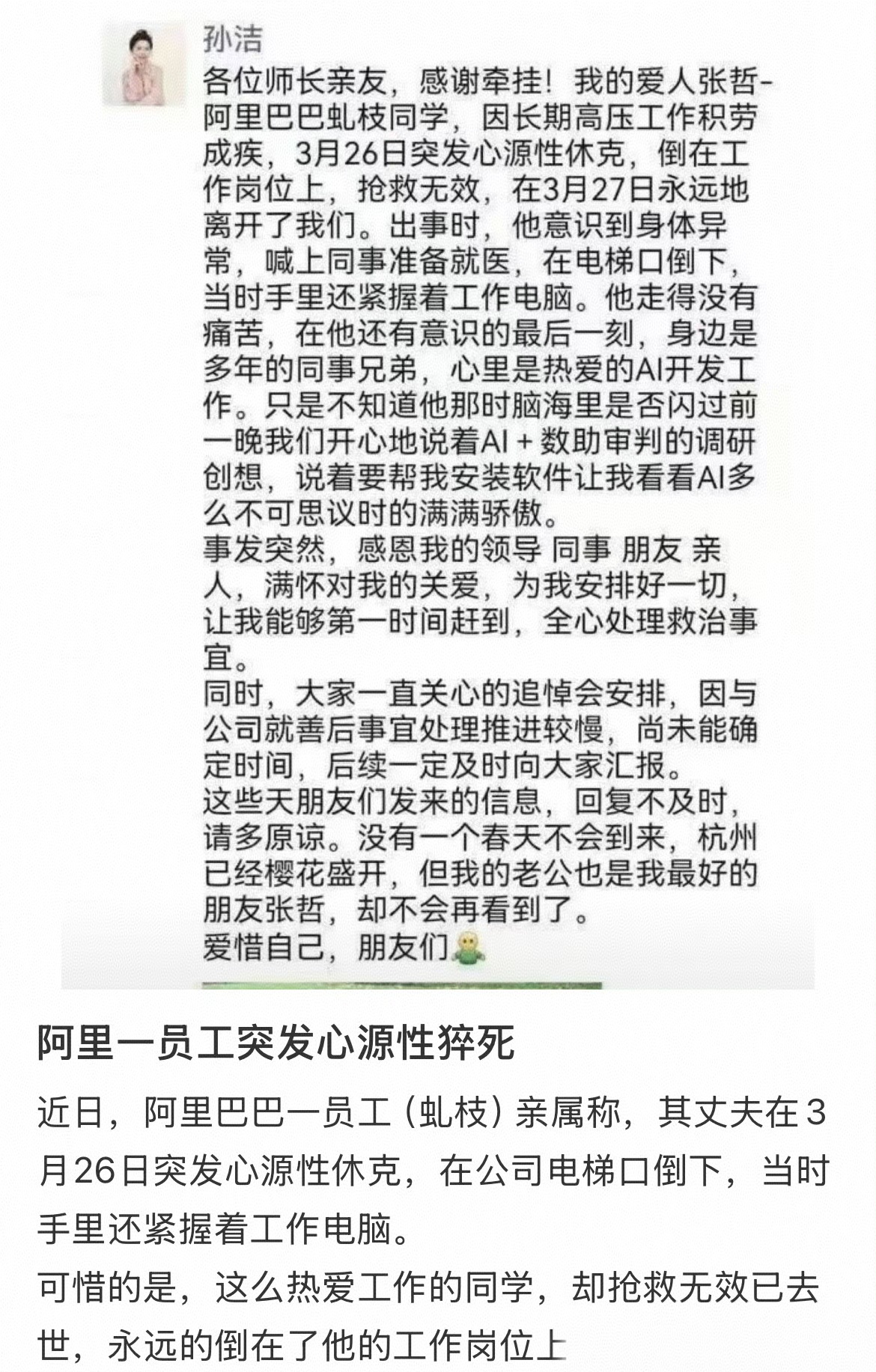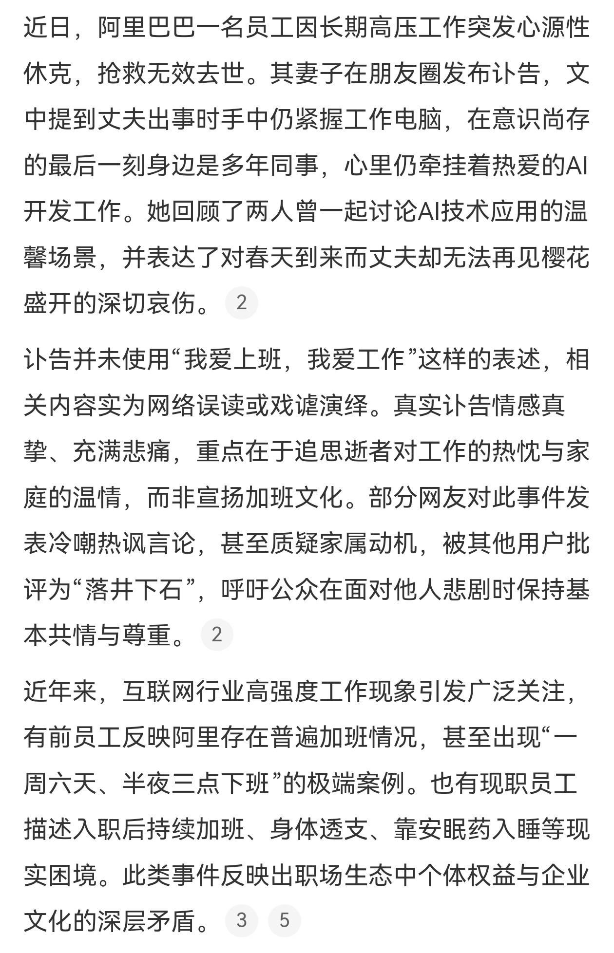 近日,又有阿里员工因过劳工作猝死,他妻子发文称,丈夫在还有意识的最后一刻,手里还紧握着工作电脑,心里还热爱着AI开发工作。面对突然离世的丈夫,妻子没有控诉公司的加班文化,反而感恩公司领导。