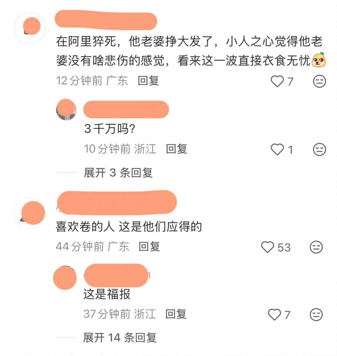 应该质疑的是,阿里在员工保障方面是否存在失职,即便通过赔偿取得逝者家属的谅解,但如何保证没有下一次?作为普通人,突然遭遇至亲离世,随后面对资本承诺赔偿、要求别闹事的重压,生活还得继续,只能发文“感恩”。