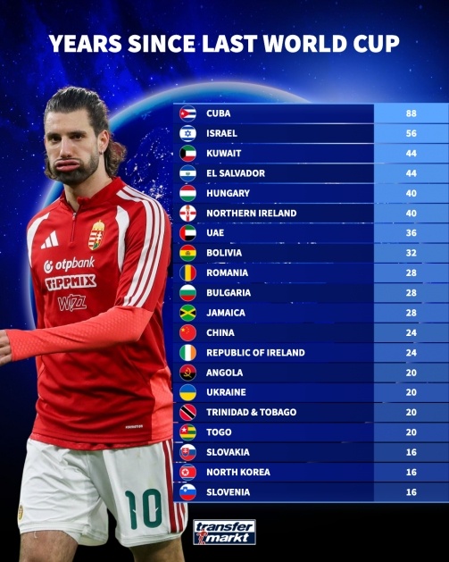 距上次参加世界杯间隔排名:古巴88年最久,国足24年第12