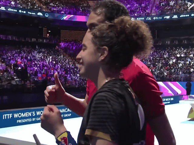 2026年澳门乒乓球世界杯汉娜高达逆转战胜袁嘉楠晋级八强后,赛后采访时和教练都留