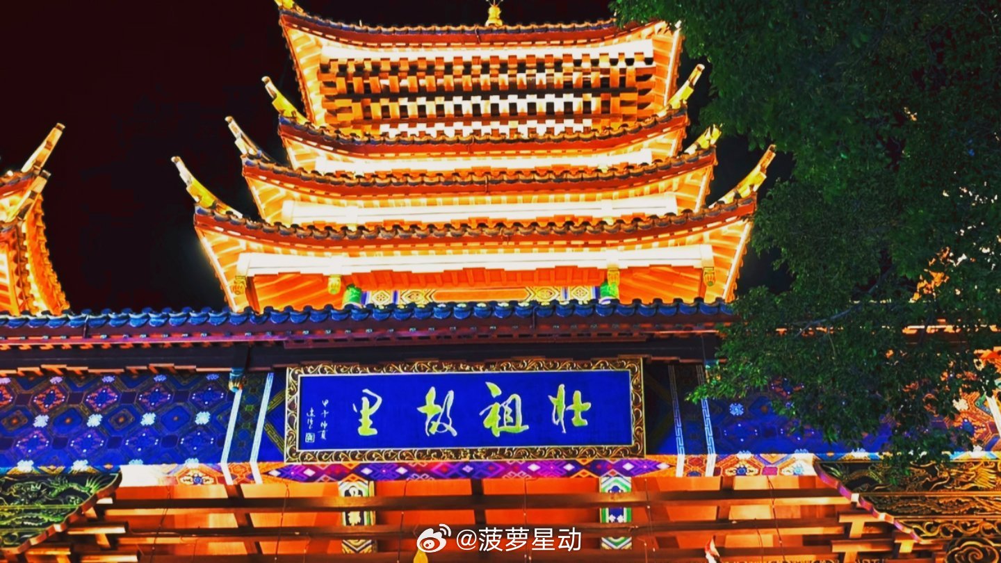 青砖黛瓦挂满红灯笼,灯光映在月亮河上,波光粼粼超梦幻 。风雨长廊、祖公塔在夜色里更显古韵,晚风带着糯米香,耳边还有悠悠壮乡小调。