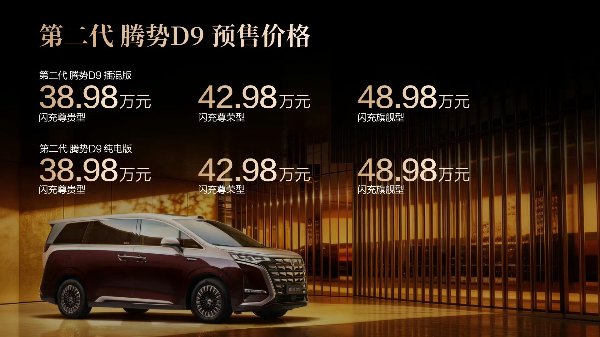 新一轮高端新能源MPV的竞争又要开始了,因为第二代腾势D9把预售价定在38.98
