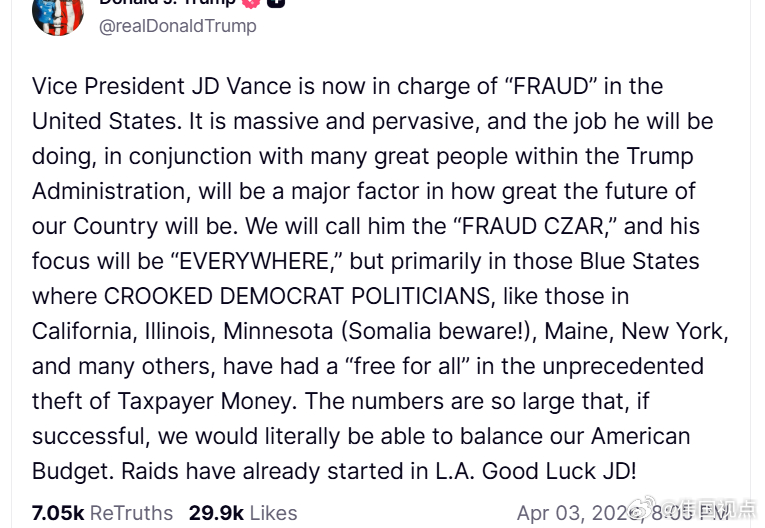 副总统万斯现在负责美国的“欺诈”问题。这一问题规模巨大且无处不在,他将与特朗普政府中的许多优秀人士共同开展工作,而这项工作将成为决定我们国家未来有多伟大的关键因素之一。