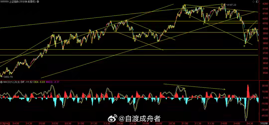 日内,3大指数高开低走,盘中有所上拉,仍然弱势下跌,跌幅分别是1%,0.99%和0.73%。成交量,两市合计16565亿,相比昨天萎缩1865亿。板块方面,仅通信设备(CPO,光通信),光学光电,半导体等极少数板块红盘,其它大面积下跌,其中体育,焦炭加工,环境监测,农业,电池,光伏设备等跌幅居前。隔夜国际油价大涨超10%,严重打击了市场人气,导致今天a股再次弱势下跌。3900长阴击穿,小反弹通道破位,后市走势有望继续下探,回探3852和3794将是大概率事件。倾向认为还有最后一跌,不会偏离3800太远,问题不大。周线来看,本周收阴十字星,和上周十字星构成搓揉线,成交量有所减少,macd死叉向下且绿柱增长,综合来看,周线还需要一些时间修复,往下空间不大。30分钟走势方面,macd死叉向下,走势继续看调整。