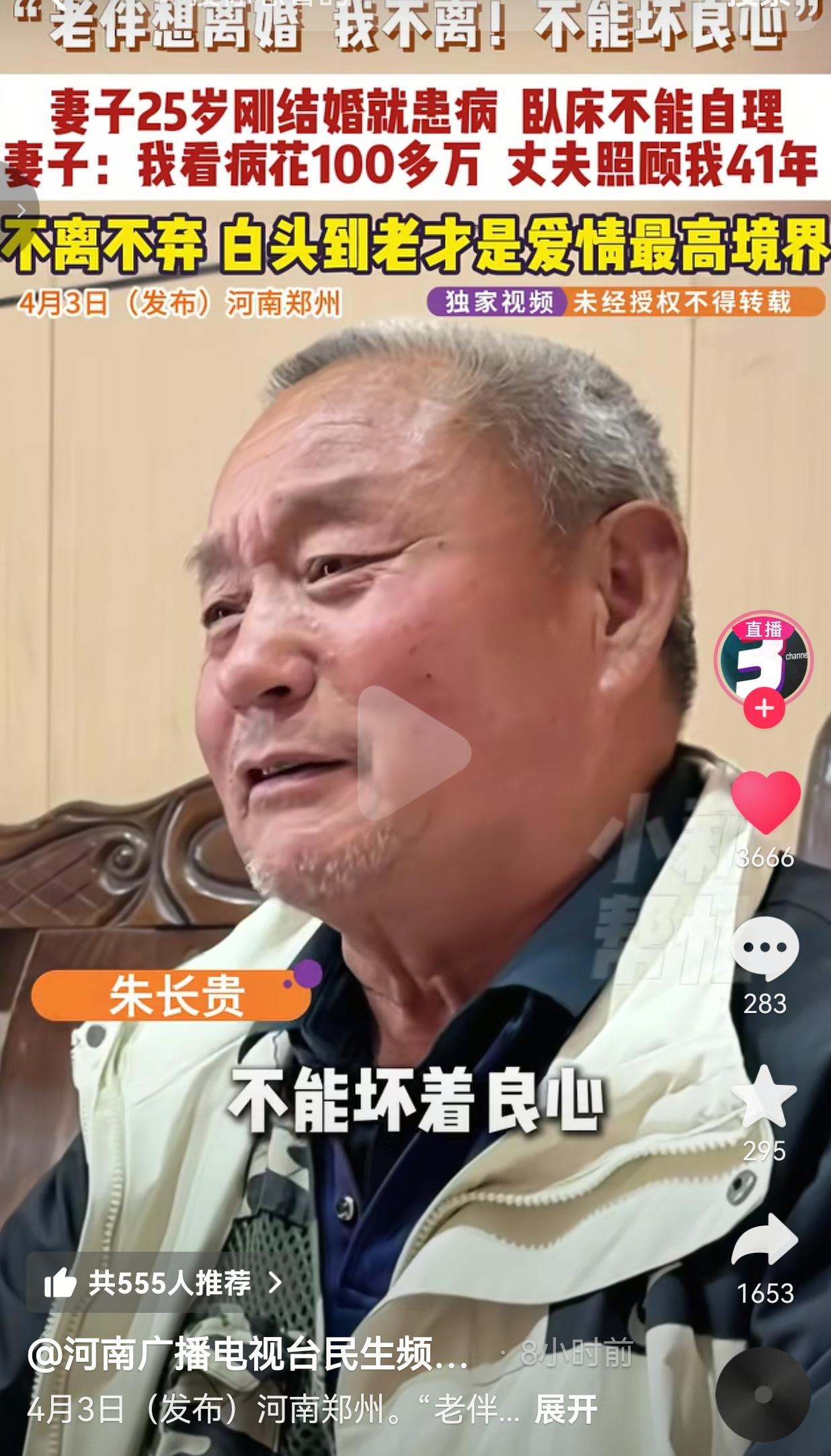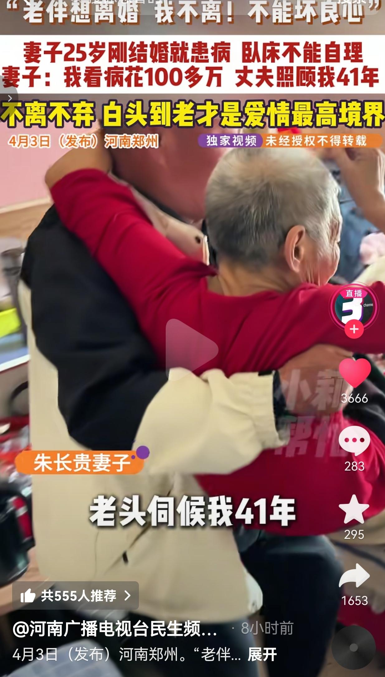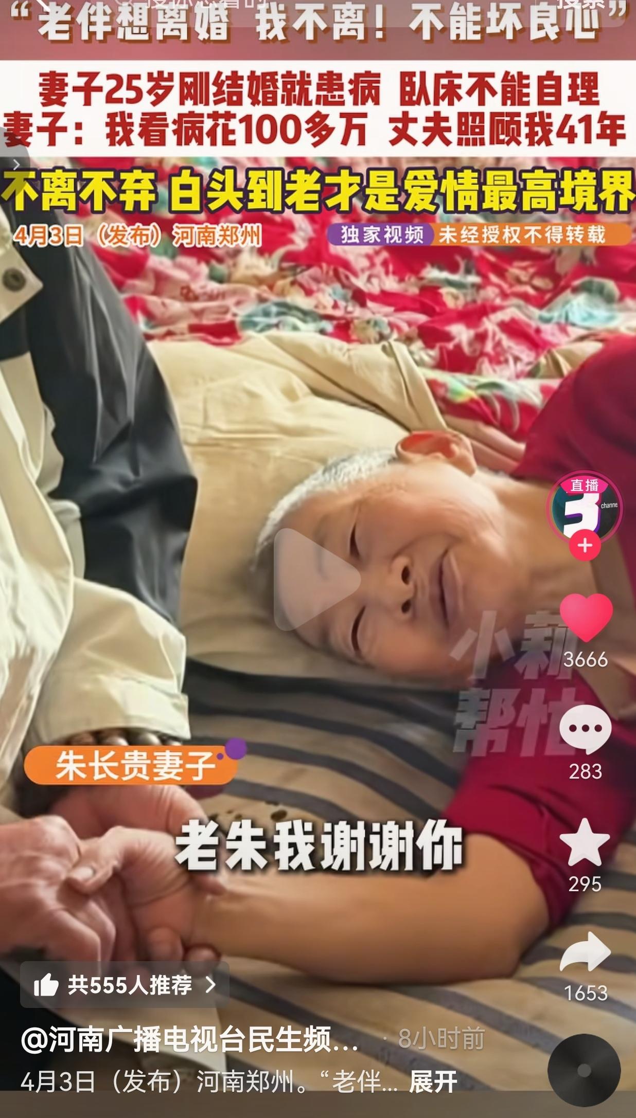 这才是爱情该有的样子!郑州66岁大爷朱长贵,把刚结婚就瘫痪的妻子,整整照顾了41年! 妻子哭着要离婚,大爷死都不肯,一句“不能坏良心”,直接戳中了所有人的泪点! 朱长贵和妻子结婚那年,妻子才25岁,正是一辈子最好的年纪。可谁知道,刚结婚没多久,妻子就突然重病,直接瘫在了床上,吃喝拉撒全不能自理,连路都走不了,连站都站不起来。 从那天起,朱长贵的人生,就只剩下“照顾老伴”这一件事。 41年啊!整整14965天! 每天早上天不亮就起床,给老伴翻身、擦身子、喂水喂饭。 老伴不能动,他就每天把她抱起来,推到院子里晒太阳,怕她闷出病。 老伴大小便失禁,他从来没嫌过脏,端屎端尿,擦擦洗洗,比亲儿子还细心。 为了给老伴治病,前前后后花了100多万,他砸锅卖铁,从来没说过一个“苦”字,没抱怨过一句。 看着老伴每天被病痛折磨,朱长贵心疼得直掉眼泪,可他从来没在老伴面前露过难色。 老伴拉着他的手哭:“这些年,真的辛苦你照顾我了。”他就笑着回:“照顾你,应该的。” 老伴心里愧疚啊,觉得自己拖累了他一辈子,哭着闹着要离婚,说:“你别管我了,你再找个好的,过自己的日子吧!” 可朱长贵想都没想,直接把老伴搂进怀里,斩钉截铁地拒绝:“不离!绝对不离!来到我家就是我的人,那我一辈子都对她好!好死不能赖活着,我该伺候伺候你,不能坏着良心!人在做天在看,我不能做那没良心的事!” 就这一句话,直接让全网破防! 这哪是夫妻啊,这是拿命在守护啊! 网友看到后评论说: 我的天!这才是真正的男人!现在的年轻人动不动就离婚,看看人家!41年啊!不是41天!这才是爱情最高的境界! 也有的网友说: 妻子25岁瘫痪,大爷照顾了41年,花了100多万,从来没放弃!换现在多少男人能做到?早就跑没影了! 还有的网友说: 老伴要离婚,大爷死都不离,一句“不能坏良心”,直接封神!这才是刻在骨子里的善良! 也有的网友说: 大爷每天抱着老伴晒太阳、喂饭,这细节太戳人了!这才是真正的爱,不是嘴上说说,是用一辈子去践行! 现在的社会,太多人把婚姻当儿戏,一言不合就离婚,把“我爱你”挂在嘴边,却连一点责任都扛不住! 可朱长贵大爷,用41年的时间,给所有人上了一课! 什么是爱情?不是花前月下,不是甜言蜜语,是你瘫了,我就一辈子抱着你;是你病了,我就砸锅卖铁给你治;是你要走,我就死都不放手! 有人说,大爷太傻了,一辈子搭进去了。可我想说,你懂什么? 大爷守的不是一个瘫在床上的病人,是他的妻子,是他的良心,是他一辈子的承诺! 妻子25岁瘫痪,人生最美好的年华都在床上度过,是大爷用41年的陪伴,给了她活下去的希望! 是大爷用41年的不离不弃,让她知道,自己从来不是累赘,从来不是负担! 那些说“大爷应该离婚找个好的”的人,我劝你别说了! 你根本不懂什么叫责任,什么叫良心,什么叫真正的爱! 朱长贵大爷,用一辈子告诉我们:什么叫“结发为夫妻,恩爱两不疑”,什么叫“执子之手,与子偕老”! 我们总说,现在的爱情太浮躁,再也没有老一辈的深情了。 可朱长贵大爷,用41年的坚守,告诉我们:真正的爱情,从来都在! 它不是轰轰烈烈的誓言,是日复一日的陪伴;它不是甜言蜜语的承诺,是一辈子不离不弃的守护;它不是大富大贵的生活,是你瘫了,我就抱着你,一辈子不放手! 这才是爱情该有的样子!这才是我们该追求的白头偕老! 最后,我想说的是:最好的爱情,不是一时的心动,是一辈子的坚守!你瘫了,我就抱着你,一辈子不放手! 对此,你怎么看?