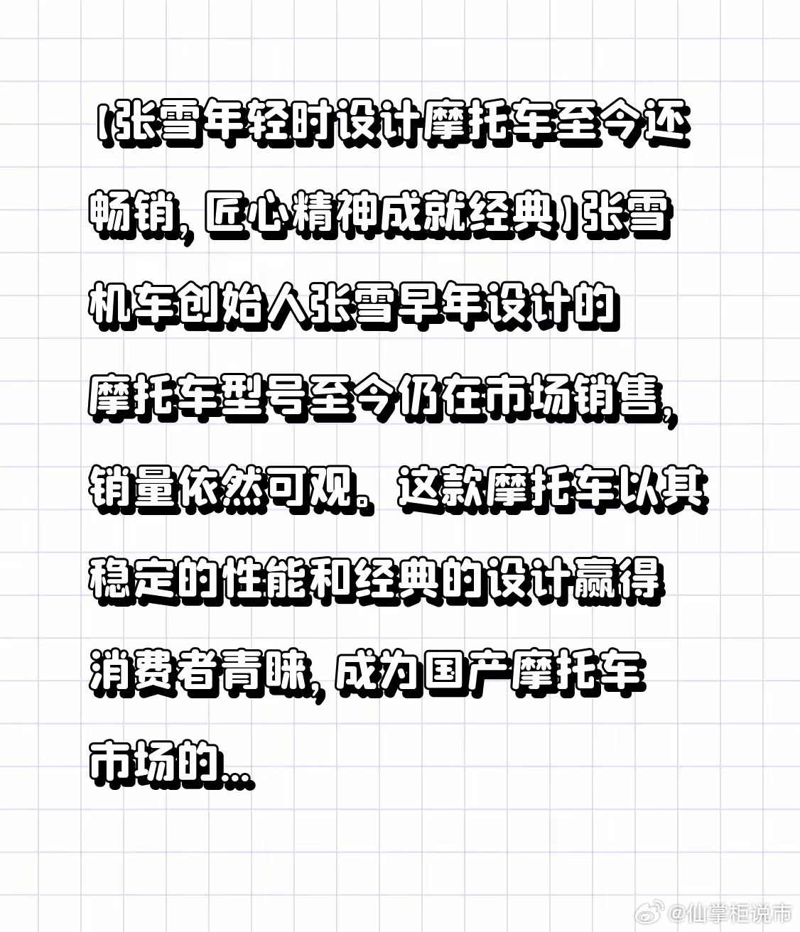 【张雪年轻时设计摩托车至今还畅销,匠心精神成就经典】张雪机车创始人张雪早年设计的摩托车型号至今仍在市场销售,销量依然可观。这款摩托车以其稳定的性能和经典的设计赢得消费者青睐,成为国产摩托车市场的常青树。泥腿子评:张雪年轻时设计的摩托车还在卖,这就是匠心的力量。好的产品经得起时间检验,经典永远不会过时。国产制造需要这种精益求精的精神。