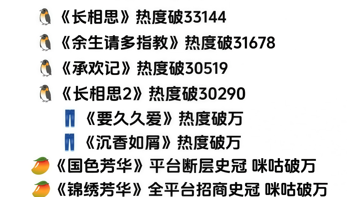 女演员三平台破万剧盘点 目前三平台破万的女演员有且仅有这三位85花赵丽颖《与凤行》《风吹半夏》《幸福到万家》95花虞书欣《苍兰诀》《永夜星河》《一个人的小森林》00花赵今麦《骄阳似我》《度华年》《开端》《漂白》 杨紫是六部破万剧《沉香如屑》《长相思》《余生请多指教》《承欢记》《要久久爱》《长相思第二季》,但是🥝缺一部
