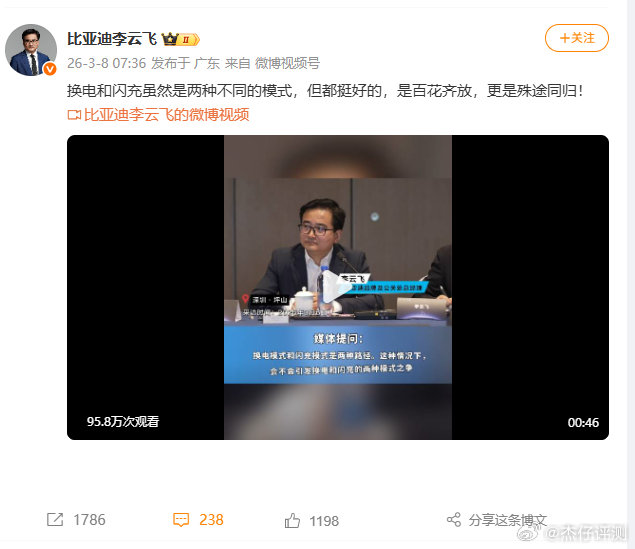 有意思,比亚迪第二代刀片电池的闪充技术出圈后,关于换电和闪充的讨论突然多了起来,飞总的一句 “百花齐放,殊途同归” 倒是把格局打开了!