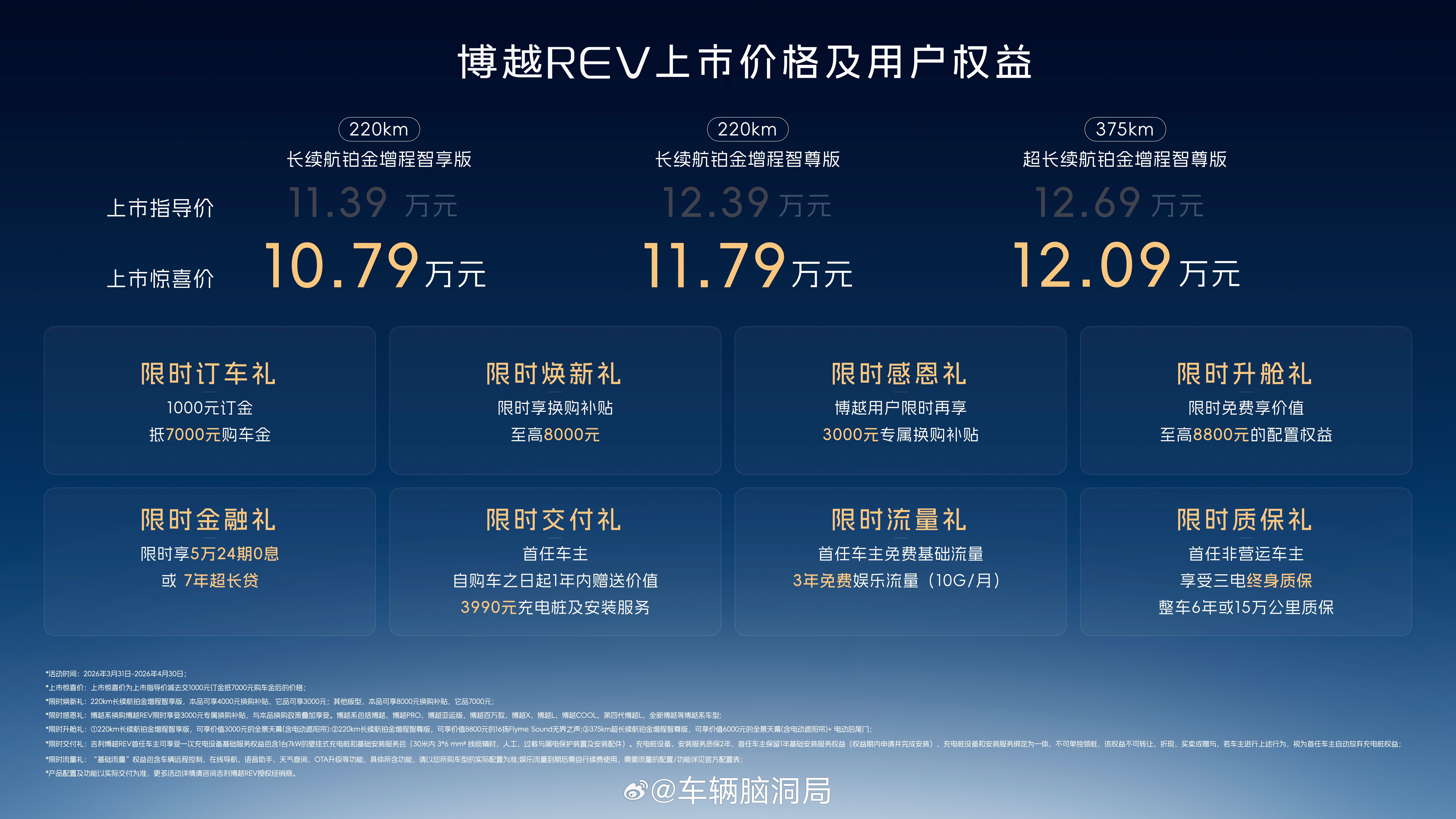 3月31日,新一代长续航增程SUV——吉利博越REV在杭州正式上市,本次发布会同步举办博越十周年用户盛典。百余名博越用户代表齐聚现场,吉利博越热爱挚友水木年华、金莎倾情献唱助阵,共同见证这款开启A+级SUV长续航增程平权时代的重磅车型全球首发。作为吉利博越十周年重磅力作,博越REV本次共推出三大版型:220km长续航铂金增程智享版、220km长续航铂金增程智尊版及375km超长续航铂金增程智尊版,上市惊喜价10.79万-12.09万元,起售价相比12.79万元的预售价格,整整下探了2万元,其中375km超长续航版本惊喜价12.09万元起,以同级领先纯电续航实力,树立A+级增程SUV价值新标杆。博越REV凭借吉利大厂品质和越级产品力,以极具诚意的售价,让20万级的高端增程体验走进更多家庭。即日起至2026年4月30日,购博越REV即可尊享十周年专属权益礼包,囊括八大限时用户权益:订车可享1000元订金抵7000元购车金,至高8000元换购补贴,博越老车主再享3000元专属换购补贴;可免费赠送价值至高8800元升舱配置,金融按揭支持5万24期0息或7年超长贷;首任车主1年内免费获赠价值3990元充电桩及安装服务,并享终身免费基础流量、3年娱乐流量(10G/月),首任非营运车主更有三电终身质保、整车6年或15万公里质保的无忧保障。博越REV精准布局A+级SUV细分市场,以 “好看、好开、长续航” 为核心优势,实现375km纯电续航、1525km综合续航的越级表现,全面覆盖用户城市通勤、短途跨城、长途出行等多场景需求,推动长续航增程技术加速普及。博越REV的全球上市,不仅进一步完善了博越家族智电时代产品矩阵,更以硬核技术实力,彰显中国汽车品牌持续向上的全球竞争力。