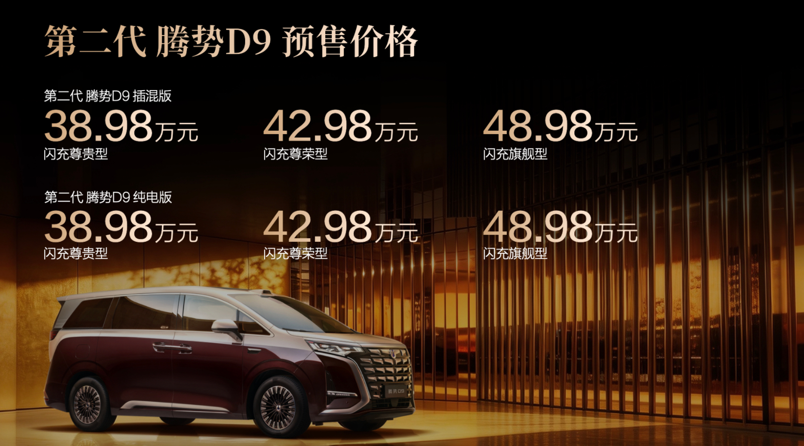 第二代腾势D9目前已经正式公布预售,38.98万元起,即日起下订,还有总共18个月的免费闪充权益。作为一款被寄予厚望的豪华MPV,它身上的技术确实亮眼,有第二代刀片电池、插混车型纯电续航401km和纯电车型800km、天神之眼5.0全系标配,还能实现5分钟充好、9分钟充满,放在当前市场里,账面实力相当能打。