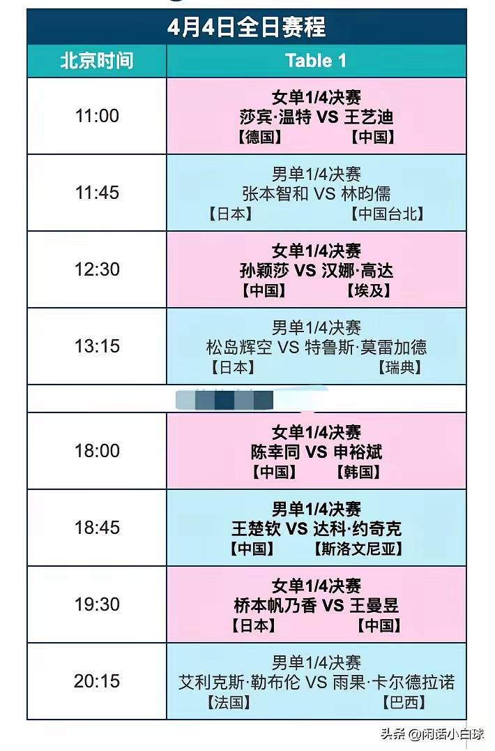 世界杯女单1/4决赛对阵出炉,国乒四位金花全线迎战外协,场场都是硬仗,没有一场能轻松过关! 11点王艺迪对阵温特堪称本轮最难一战,温特反手防弧打法专克大力相持,能突然卸力变线,前不久刚击败过王艺迪,大迪这次必须及时调整节奏。12点半孙颖莎迎战非洲一姐汉娜高达,对手球路刁钻灵动,还研究了莎莎两百多场比赛,准备十分充分,绝不能轻敌。王曼昱对阵桥本帆乃香,打削球最耗心神,虽交手占优也要稳扎稳打。陈幸同面对涨球明显的申裕斌,正手实力大涨的韩国小将,同样不好对付。 在我看来,本轮最大悬念不在实力差距,而在打法克制与心态调整,怪拍与黑马扎堆,国乒想包揽四强必须拿出十二分专注。
