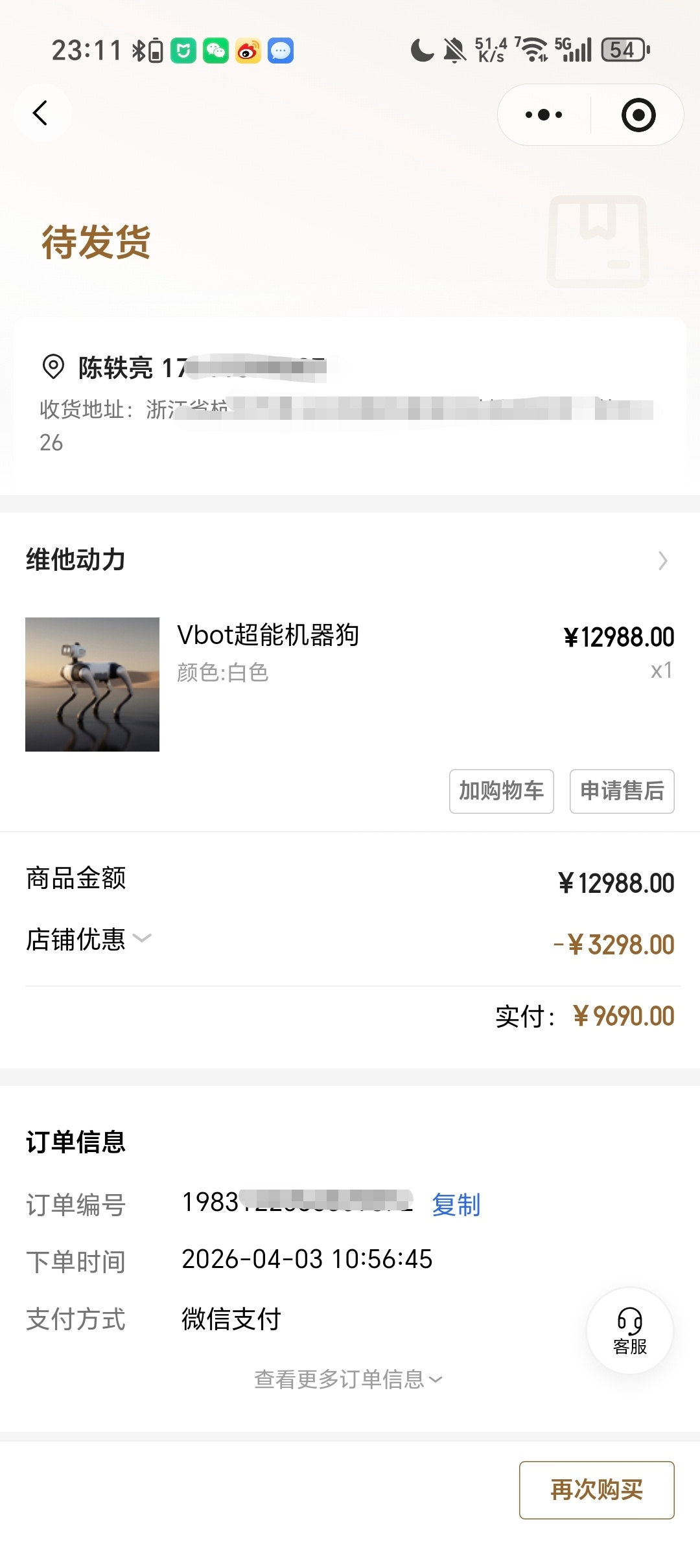 好久没给自己买玩具了,一上来就买了个贵的,维他动力的 Vbot 超能机器狗