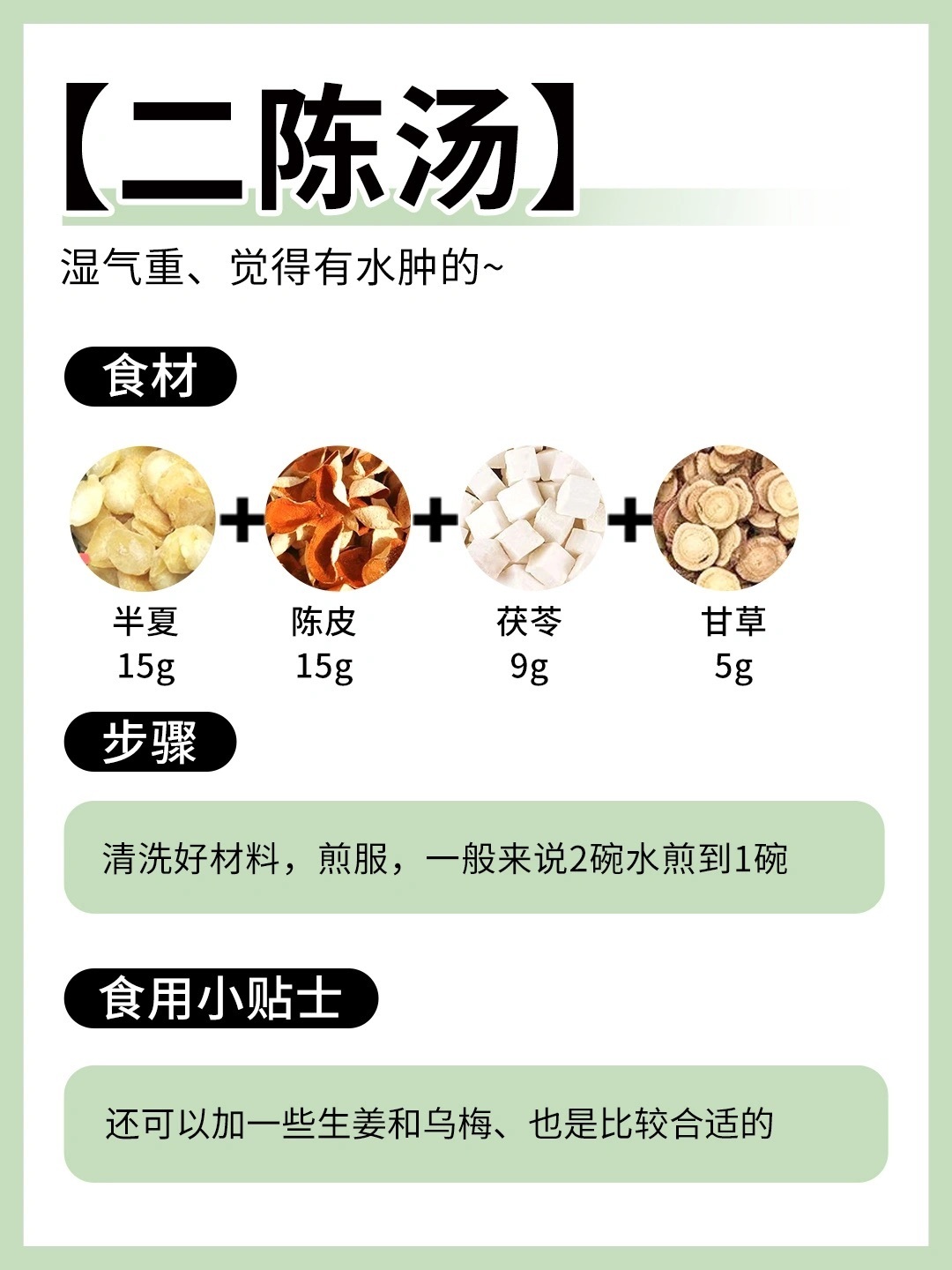 食材:半夏15g+陈皮15g+茯苓9g+甘草5g(祛湿健pi)做法:清洗好材料,煎服,一般来说2碗水煎到1碗