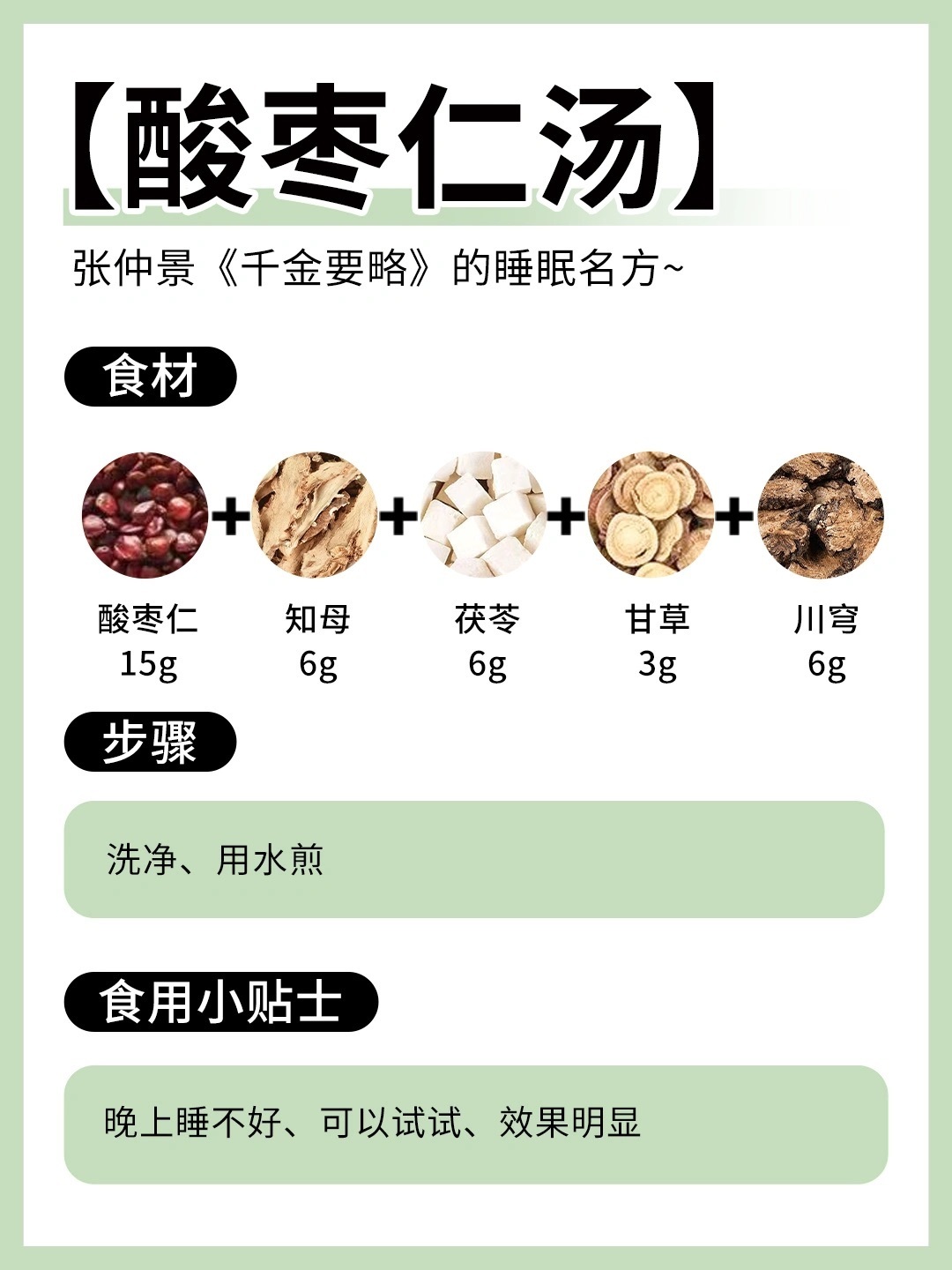 食材:酸枣仁15g+知母6g+茯苓6g+甘草3g+川穹6g做法:洗净、用水煎小贴士:晚上睡不好、可以试试、效果明显武医张鹏微博中医药月国医的精诚力量