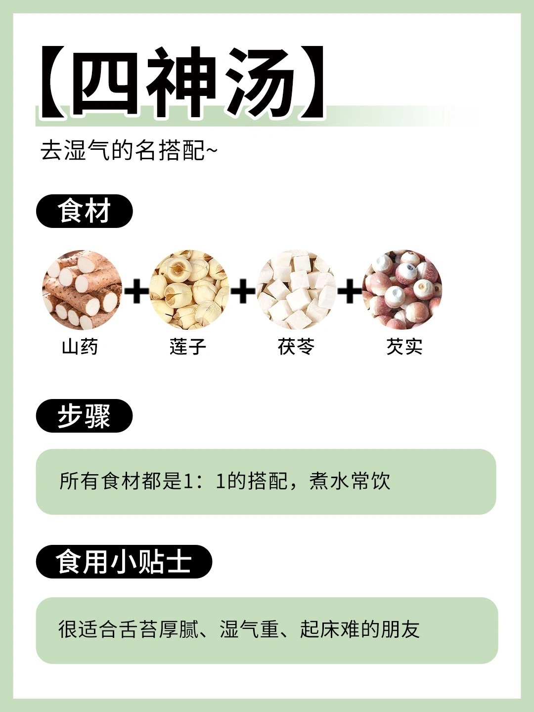 食材:山药+莲子+茯苓+芡实做法:所有食材都是1:1的搭配,煮水常饮小贴士:很适合舌苔厚腻、湿气重、起床难的朋友