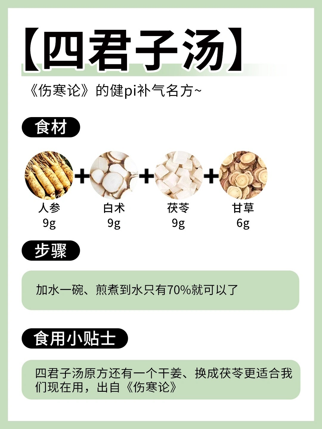 食材:人参9g+白术9g+茯苓9g+甘草6g做法:加水一碗、煎煮到水只有70%就可以了小贴士:四君子汤原方还有一个干姜、换成茯苓更适合我们现在用,出自《伤寒论》