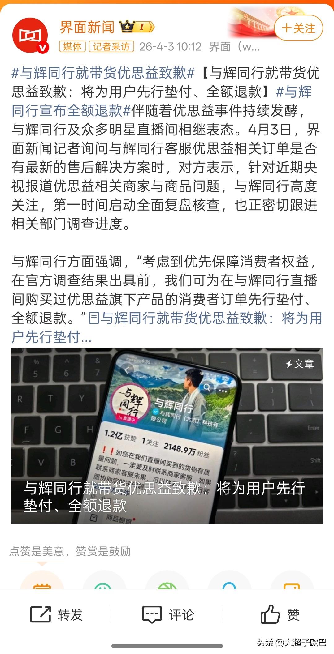 关于“假洋货“优思益的解决方案与辉同行回应了,没有大家所期待的假一赔十,也没有所谓的退一赔三,与辉同行的解决方案,将为用户先行垫付,全额退款。 但是另外有个特别奇怪的问题,为什么一个商品出了问题很多直播间很多主播都在外,为啥大部分人都盯着与辉同行反而去骂董宇辉呢?商品出了问题不能把所有问题全部归到一个主播身上呀,骂他的人是在他直播间下单的人吗?大多数不是,不知道这些人处于一个什么心理,是盼着董宇辉翻车?人设崩塌?