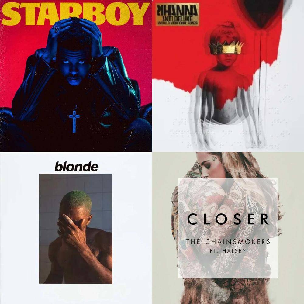 不管是TheChainsmokers的Closer、JustinBieber的LoveYourself、Beyoncé的Lemonade、TheWeekend的Starboy、FrankOcean的Blonde还是Rihanna的最后一张专辑ANTI,许多年轻人被2016金曲串烧打了当头一棒——