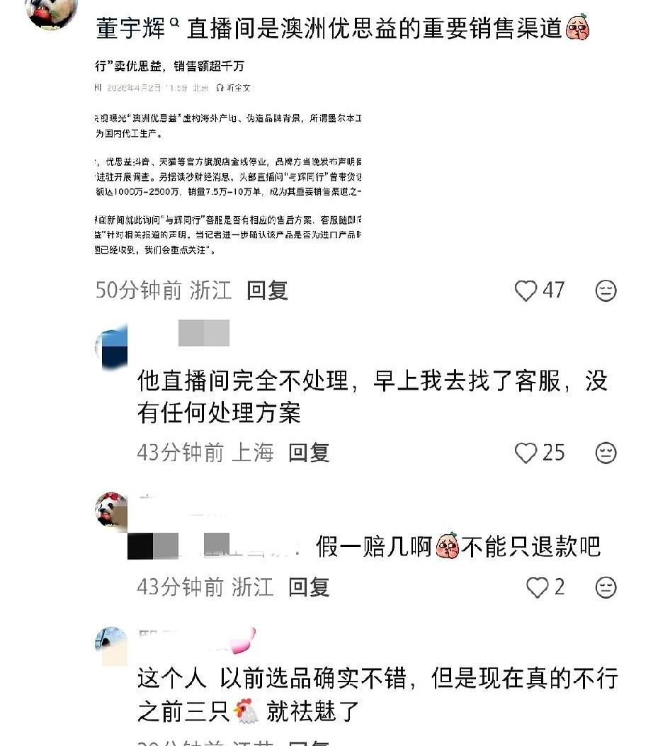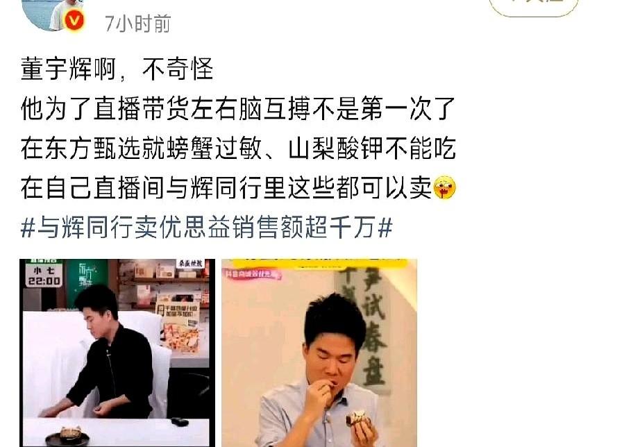 俞敏洪和董宇辉的分道扬镳,现在回头看,越来越像一场“路线”切割。 东方甄选那边要去搞线下店,不急不躁地铺路。 与辉同行这边,却一头扎进了另一个剧本:辛巴和三只羊的剧本。 目标只有一个:直播间在线人数必须十万加,单场销量必须冲上抖音榜首。 于是,那个号称所有产品都亲自审核的董老师,选品逻辑变得异常简单。什么东西利润高,就上什么。谁在榜上刷的礼物最凶,购物车的链接就给谁。 直播间里,一块饼干品牌的标志在礼物榜上疯狂闪烁,从榜五一路冲到榜一。没多久,那块饼干就真的出现在了小黄车里,成了当晚的主角。 最有意思的是什么? 粉丝们一提人气和流量,就把他跟辛巴、李佳琦放一起比,觉得脸上有光。 可一提到做慈善、做公益,这个对标的名单,就又悄悄收回去了。 说白了,文化人带货的尽头,可能也还是那个老江湖。