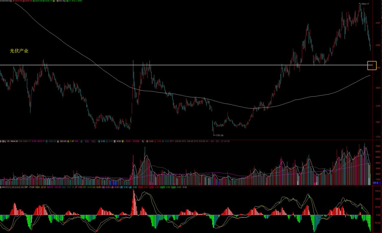 光伏大跌,市场在预期你的预期 光伏、化工还没跌的时候,黑马就多次提醒爱粉们要提防后面补跌。现在回头一看,光伏最大跌幅18%,化工最大跌幅17%,真到现在还没有明确见底信号,当初的提醒是不是很及时很对路?抄大底逃大顶是投资必修课,决定着我们能不能把握住大机会、躲避大风险,所好的是经过这么多年实战,终于修炼出敏锐洞察力,在重要节点上提前发现主力动向,及时调整投资策略。比如2023.12熊市大底部果断入场布局,再如2025.2果断清仓暴涨的科技,长期关注黑马的真爱粉对此一定印象深刻。 光伏指数近期大跌主要三大原因: 一是大涨后的补跌。前面一直非常抗跌,市场调整末段,抗跌板块通常会有补跌。 二是行业复苏存在不确定性。内卷还没有全面结束,过剩产能尚未完全出清;白银等原材料涨价推高生产成本,在产能过剩情况下,想要顺畅转嫁成本并不容易;中东战争引发传统能源过度依赖担忧,发展光伏等新能源成为众多国家要面对的现实,但市场需求到底有多大、何时兑现存在不确定性。 三是市场在交易战争即将结束预期。战争打得一片火热时,市场交易新能源替代传统能源需求预期;战争即将结束时,市场就转向交易兑现预期,调整就不可避免。 这波调整有望回踩白线强支撑,这里是峰顶线与年线构成的共振强支撑,或有止跌机会,观察盘面信号予以确认。