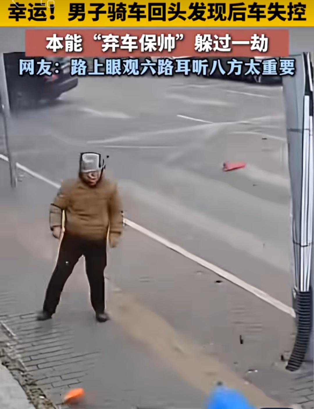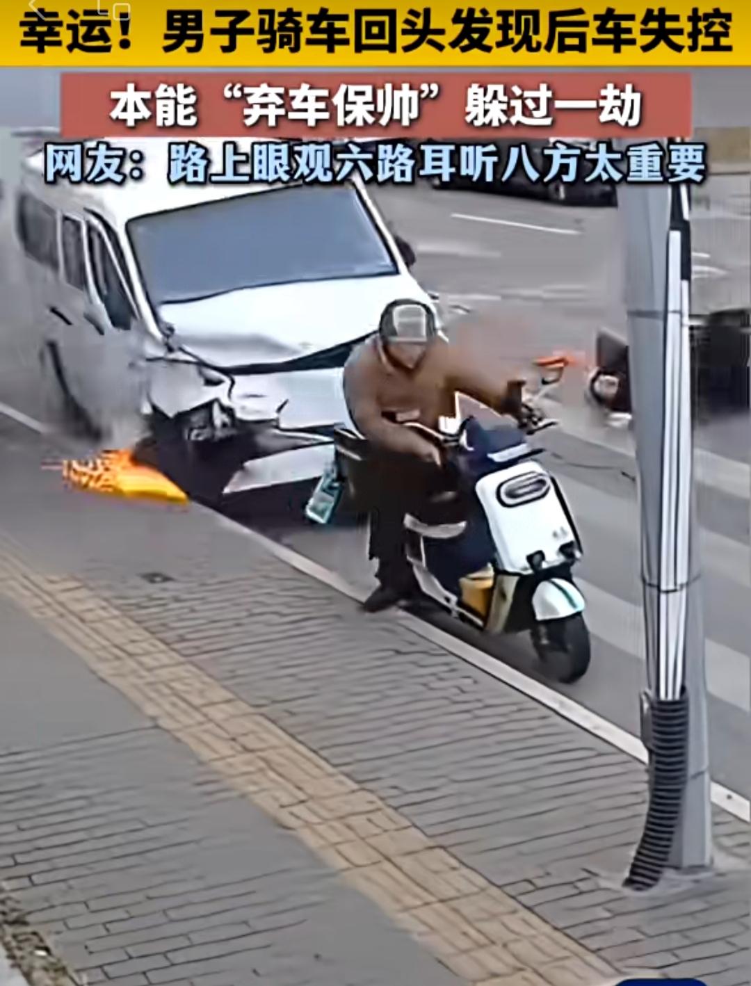 监控画面里的这一幕,简直让人手心冒汗!3月17日,浙江某路口,一名男子正骑着电动车正常等红灯,一切都和往常一样平静。 谁也没想到,危险正从后方急速逼近!就在男子下意识回头的一瞬间,瞳孔猛地收缩,后方一辆白色轿车正失控冲来,车头已经严重变形,像是一头脱缰的猛兽直扑而来! 没有丝毫犹豫,也没有时间思考,男子凭借本能,瞬间弃车纵身一跃,堪堪避开了失控车辆的撞击范围。下一秒,轿车狠狠撞在路灯杆上,碎片飞溅,场面触目惊心,而他,仅在毫厘之间躲过了这场劫难! 这0.1秒的反应,看得全网直呼“封神”!网友们纷纷评论:“这就是传说中的眼观六路耳听八方吧!”“太惊险了,这一跳救了自己一命!” 这反应速度绝了!真就是生死一瞬间,多愣0.1秒都没了,大哥命大! 电动车没了可以再买,人没事才是最重要的!这波“弃车保帅”教科书级避险,给所有骑电动车的人上了一课! 其实,这起惊险事件给所有交通参与者敲响了警钟。路口本就是事故高发地,看似平常的等红灯时刻,也可能暗藏危机。回头一瞬间