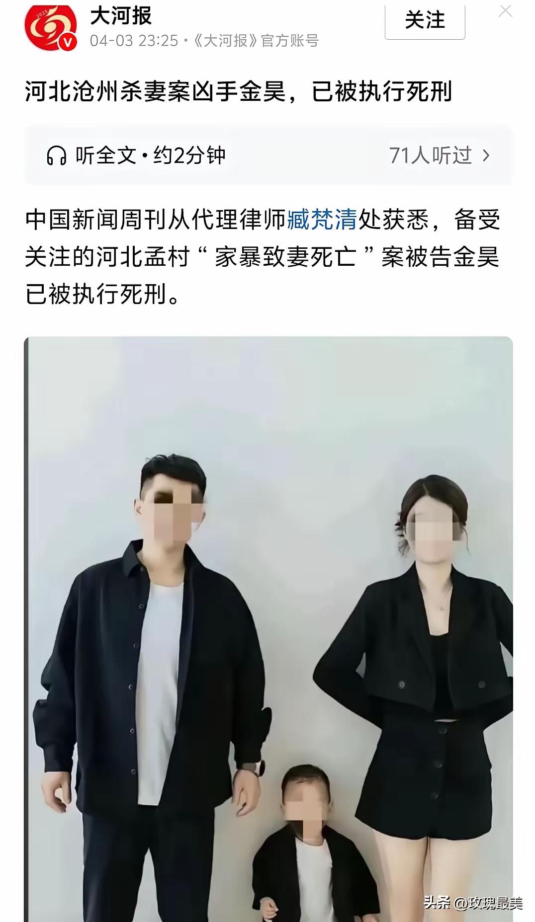出轨杀妻恶魔终于伏法! 河北沧州杀妻案的凶手金X日前伏法,他可怜的妻子刘某某终于可以瞑目了。说起来刘某某,跟渣男丈夫不仅是高中同学还是大学同学,而且为了能跟金昊做大学同学,不惜降分报考大专院校,真是典型的恋爱脑! 五年恋情,四年婚后生活,还为金昊育有一子,却仍然没有挡住金昊出轨。等到刘某某发现的时候,已有身孕的小三不仅不知羞耻,还打电话向金x告黑状。 金X早有家暴的前科,这次更是暴露了凶残本性,竟然打死刘某某。金母知道以后,不仅没有大义灭亲,反而包庇儿子,公然找人出具假的死亡证明,真是不是一家人,不进一家门! 据刘某某的弟弟反映,刘某某婚后不久即遭家暴,却没有及时抽身而去,反而幻想渣男会痛改前非。她难道不知道家暴只有零次和无数次的区别吗?