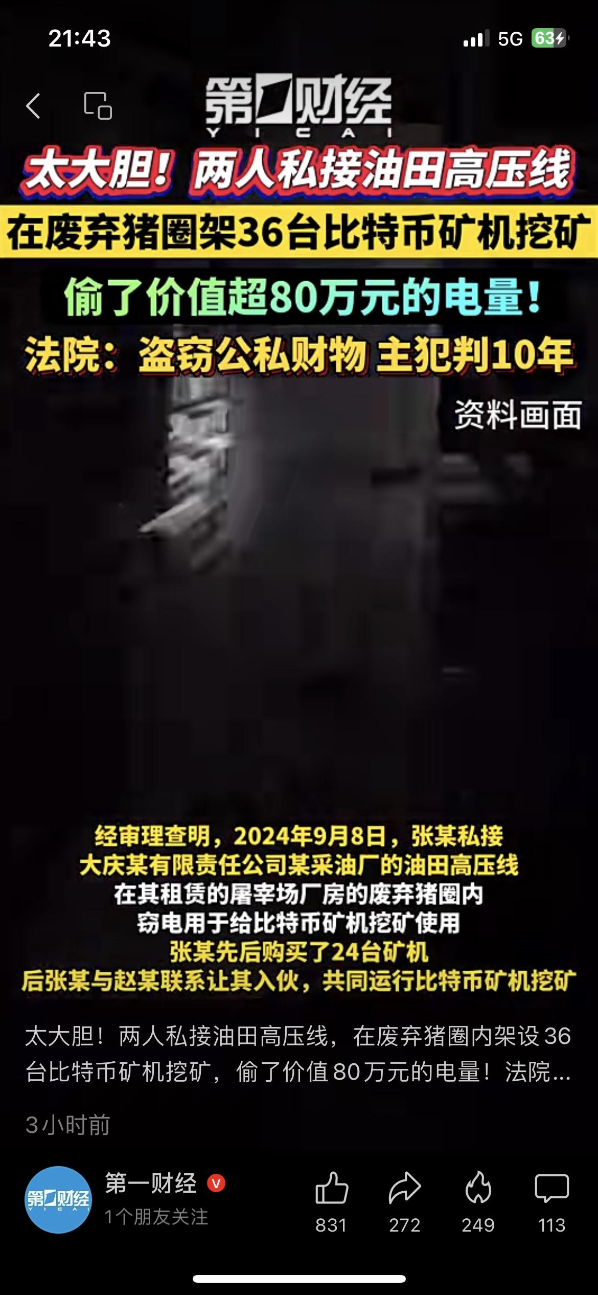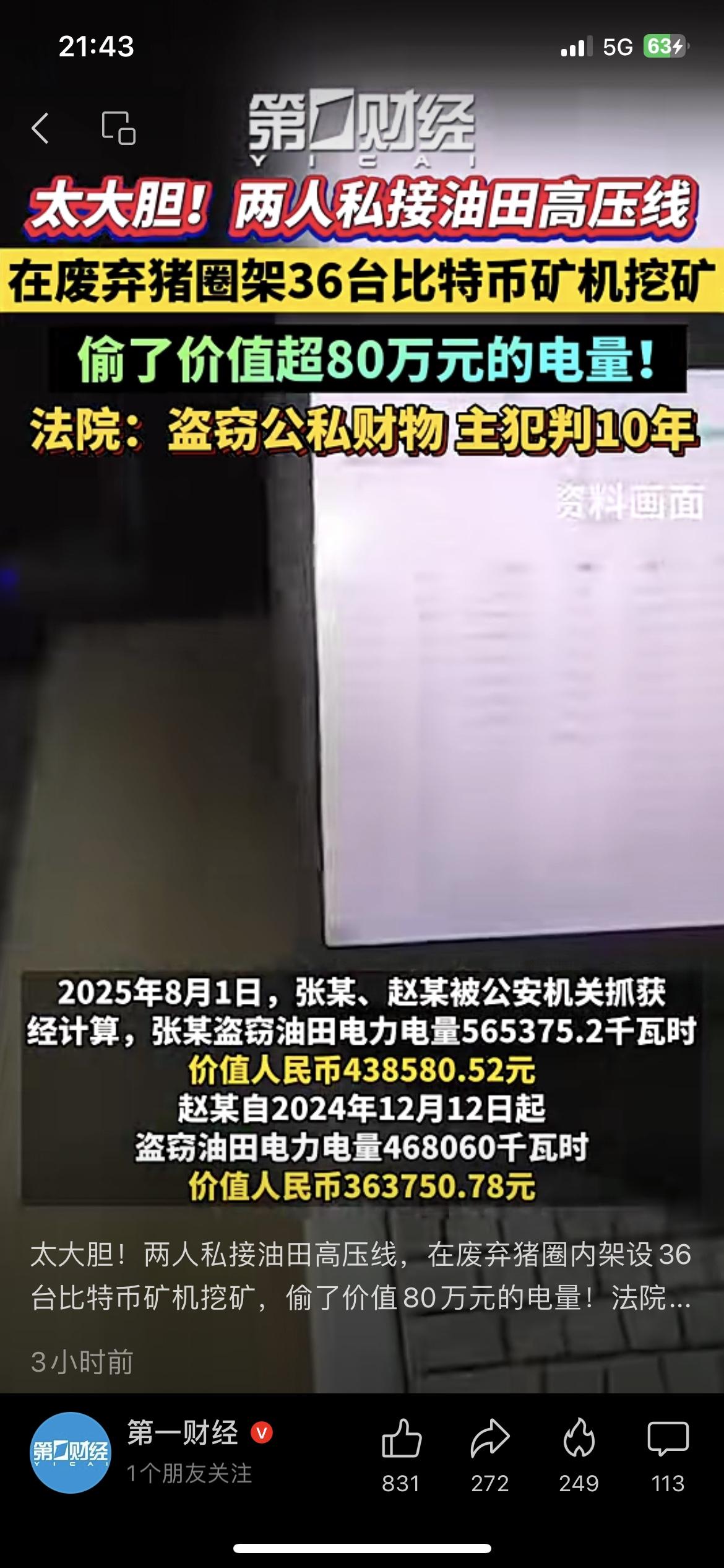 真敢干!黑龙江大庆两人,为挖比特币私接油田高压线,在废弃猪圈架36台矿机疯狂挖矿! 法院查明,两人累计窃电价值超80万元。最终主犯张某被判10年有期徒刑,同伙赵某被判4年10个月。 为虚拟货币铤而走险,偷国家电力,把人生搭进去太不值。 别信挖矿暴富,违法必被抓。你觉得这个判罚合理吗? 比特币挖矿 窃电 违法犯罪