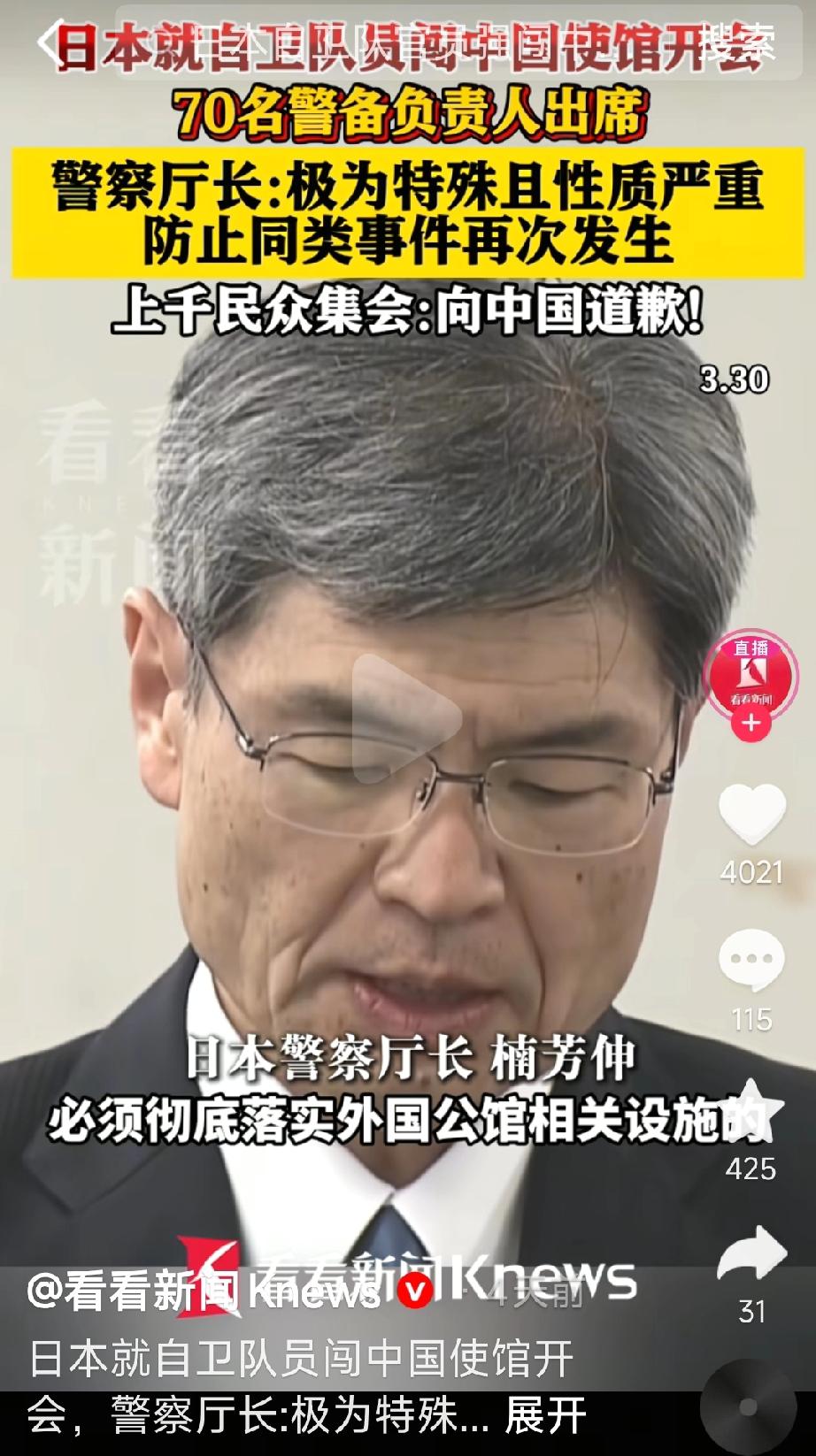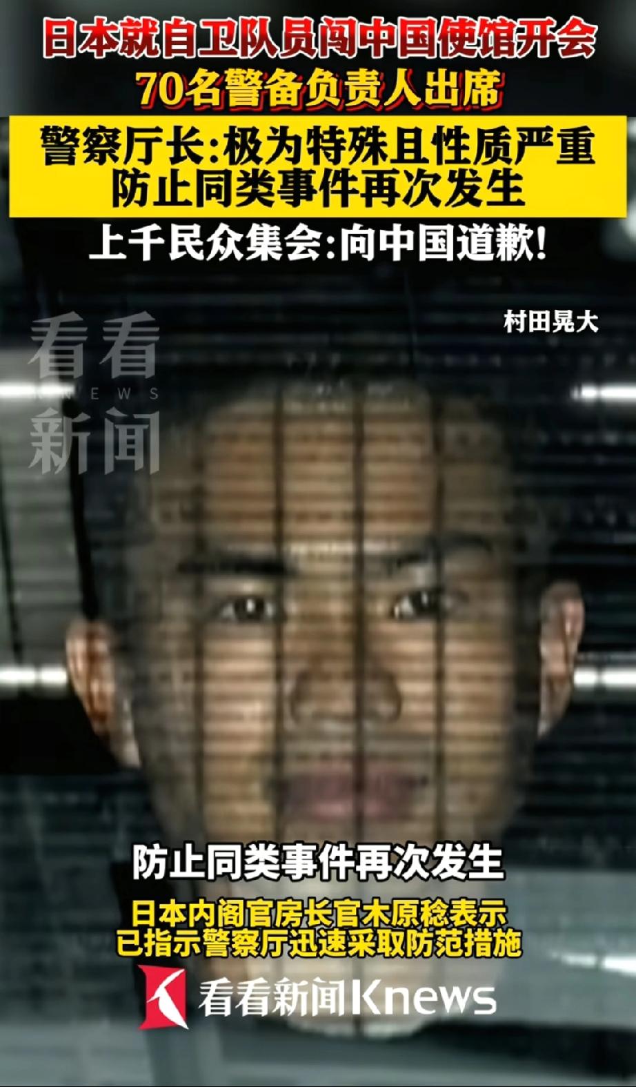 日本自卫队员持刀强闯中国使馆,严重违反《维也纳外交关系公约》。日方仅表"遗憾"的敷衍态度,暴露其推卸责任的傲慢。值得肯定的是,日本民众举行千人集会,高喊"中国对不起",要求政府道歉。这展现了民间对和平的珍视和对国际法的尊重。日方应正视错误,彻查事件,给中方负责任的交代,避免进一步损害中日关系。