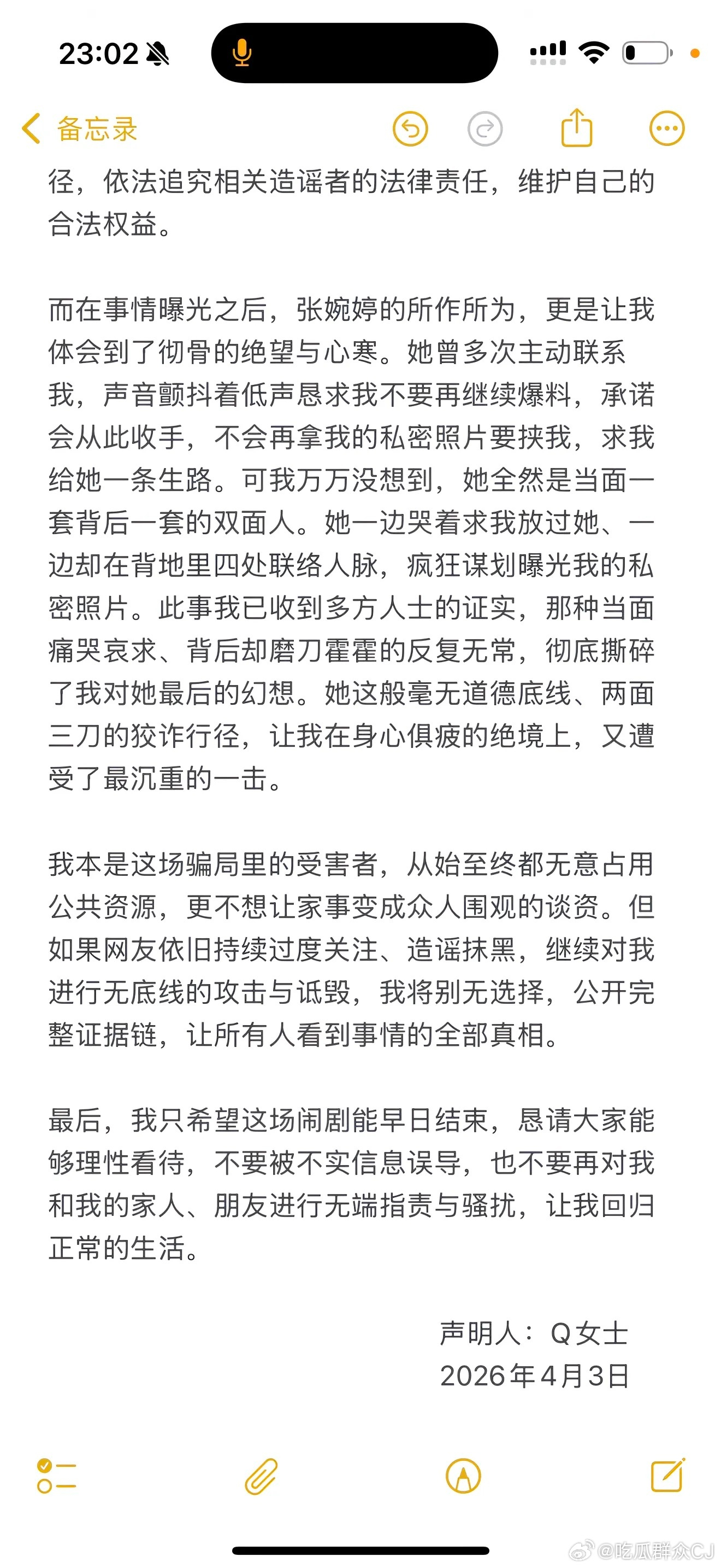 Q女士回应插足宋宁峰张婉婷 Q女士回应插足宋宁峰、张婉婷:1、在ktv认识,宋宁峰骗她已离婚2、张婉婷对她进行无休止的骚扰与威胁3、宋宁峰只顾对外撇清、疯狂甩锅4、事情曝光后,张婉婷一边求她给一条生路,一边四处联络人脉,疯狂谋划曝光她的私密照片。